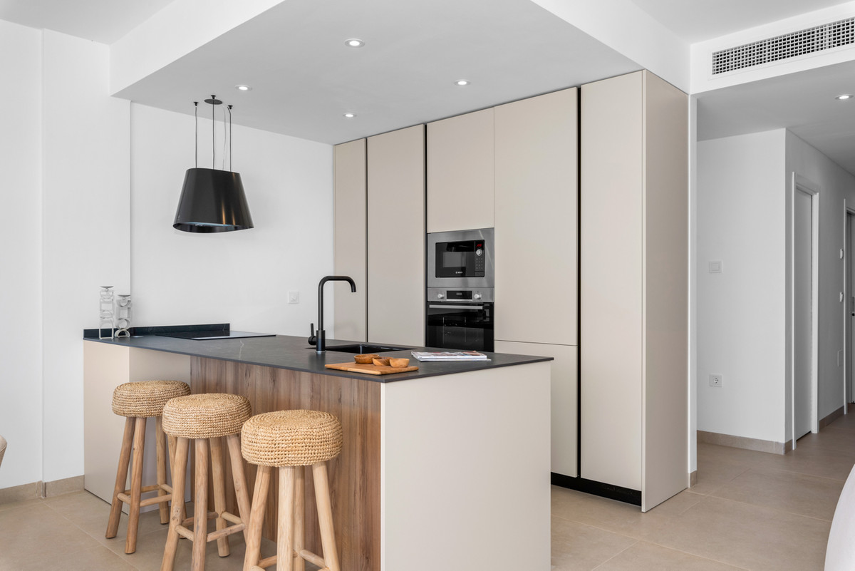 Moderne lejligheder i stilrent design, skabt med åbne rum og store vinduer, køkkenø og soveværelse med walk-in-closet. To badeværelser. Stuelejlighederne har store terrasser med udsigt til poolen, mens penthouse-lejlighederne har et solarium på over 70 m². Alle boliger inkluderer en parkeringsplads i kælderen samt depotrum.