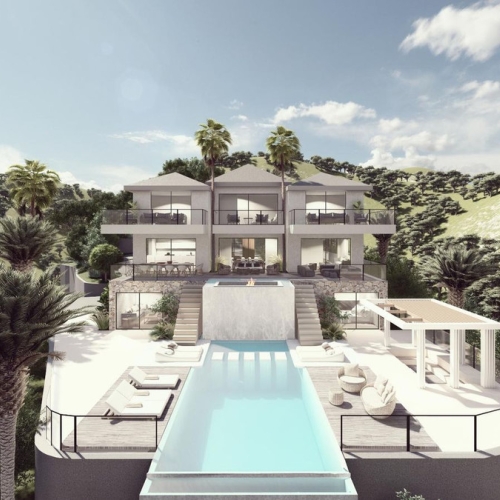 On the lower level, the villa offers a large garage for up to six cars, a laundry area, and ample storage space. There is also an exciting opportunity to extend the property, with the potential to build an upper floor or create an independent apartment behind the garage, complete with large west-facing windows and another private terraces.