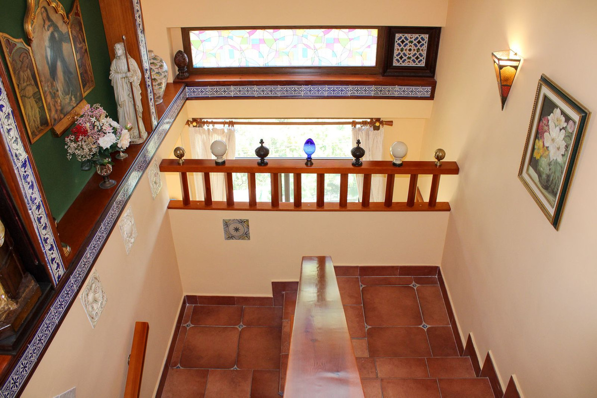 Tilbage til hallen, og vi går op til øverste etage, hvor vi direkte til venstre har en udgang til endnu en stor terrasse. Du kan også nå terrassen fra soveværelset, som ligger ved siden af. Dernæst har vi et badeværelse og to soveværelser mere, sidstnævnte soveværelse har adgang til endnu en terrasse. Herfra kan man se et lille glimt af havet.