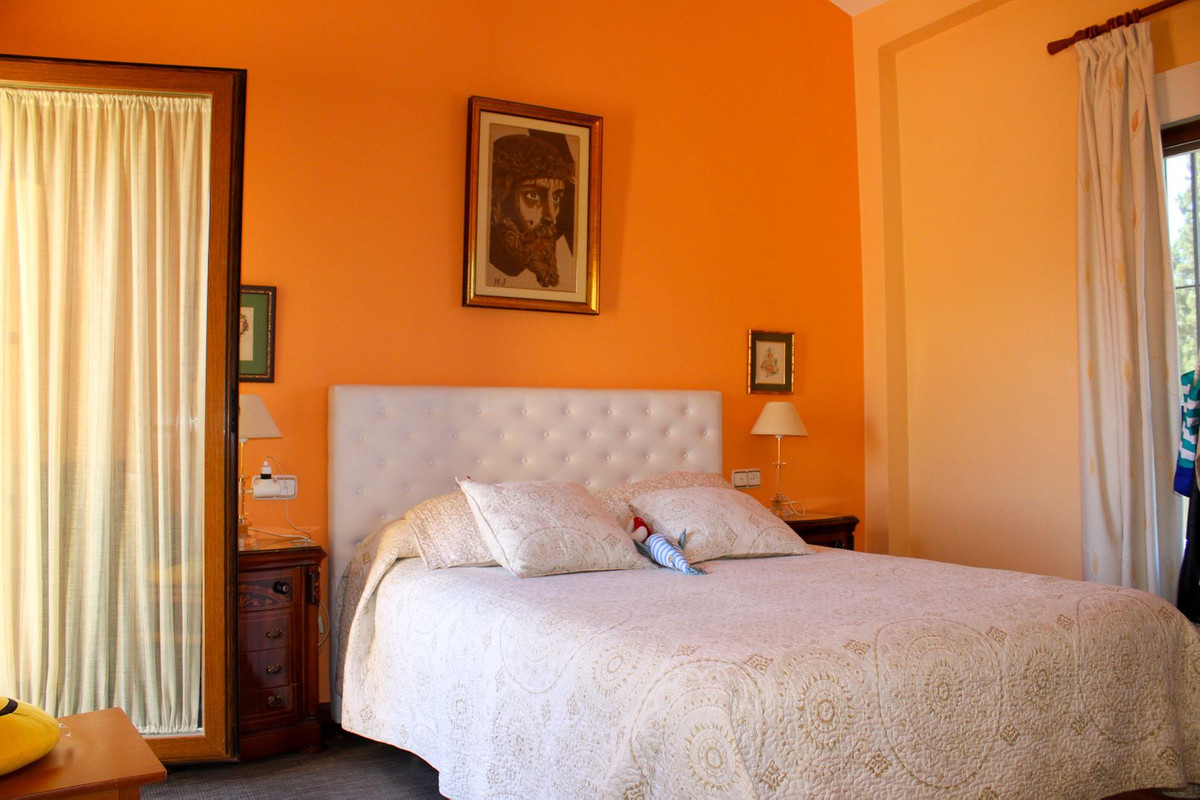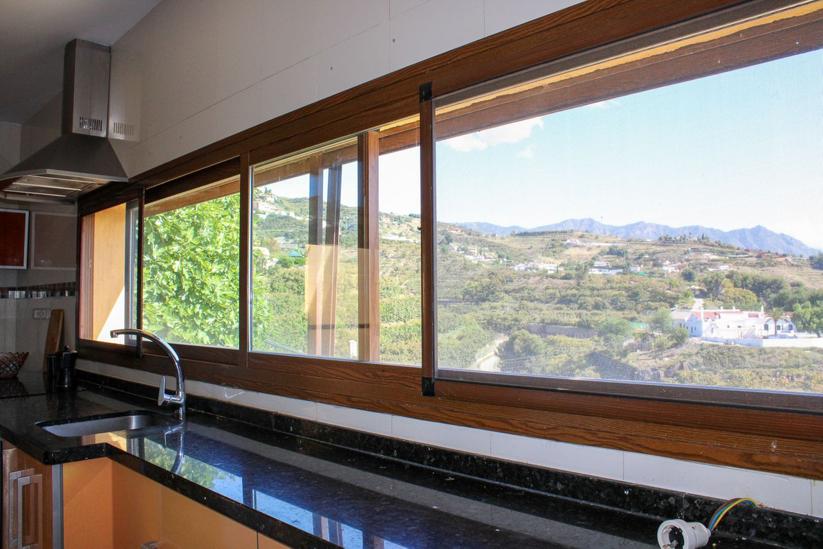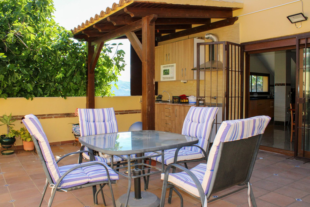 Dette efterfølges af yderligere to soveværelser og, ved siden af dem, et stort fuldt udstyret køkken med åben forbindelse til stuen med endnu en brændeovn. Køkkenet og stuen har mange vinduer, der giver masser af lys, og fra køkkenet er der også en fantastisk udsigt over bjergene. Herfra kommer du til endnu en terrasse, hvor der også er et udekøkken.