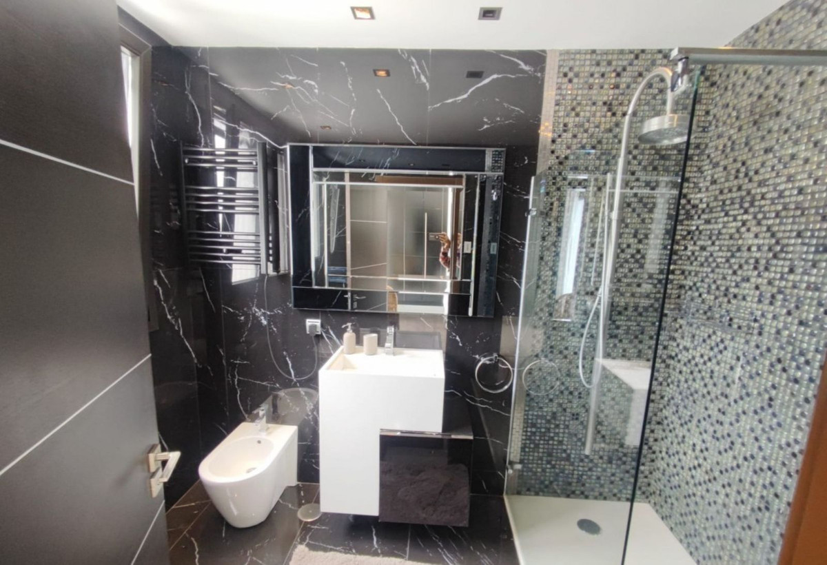 Built across two floors, this modern villa offers four double bedrooms with en-suite bathrooms and one single bedroom with a private shower room. The master suite has direct access to a large terrace overlooking the garden and pool, and includes a modern dressing room. The property is equipped with all contemporary amenities, including a utility room, private gym, home automation system, and a large integrated garage capable of parking at least four cars.