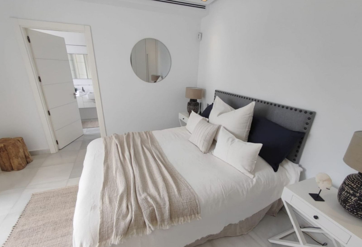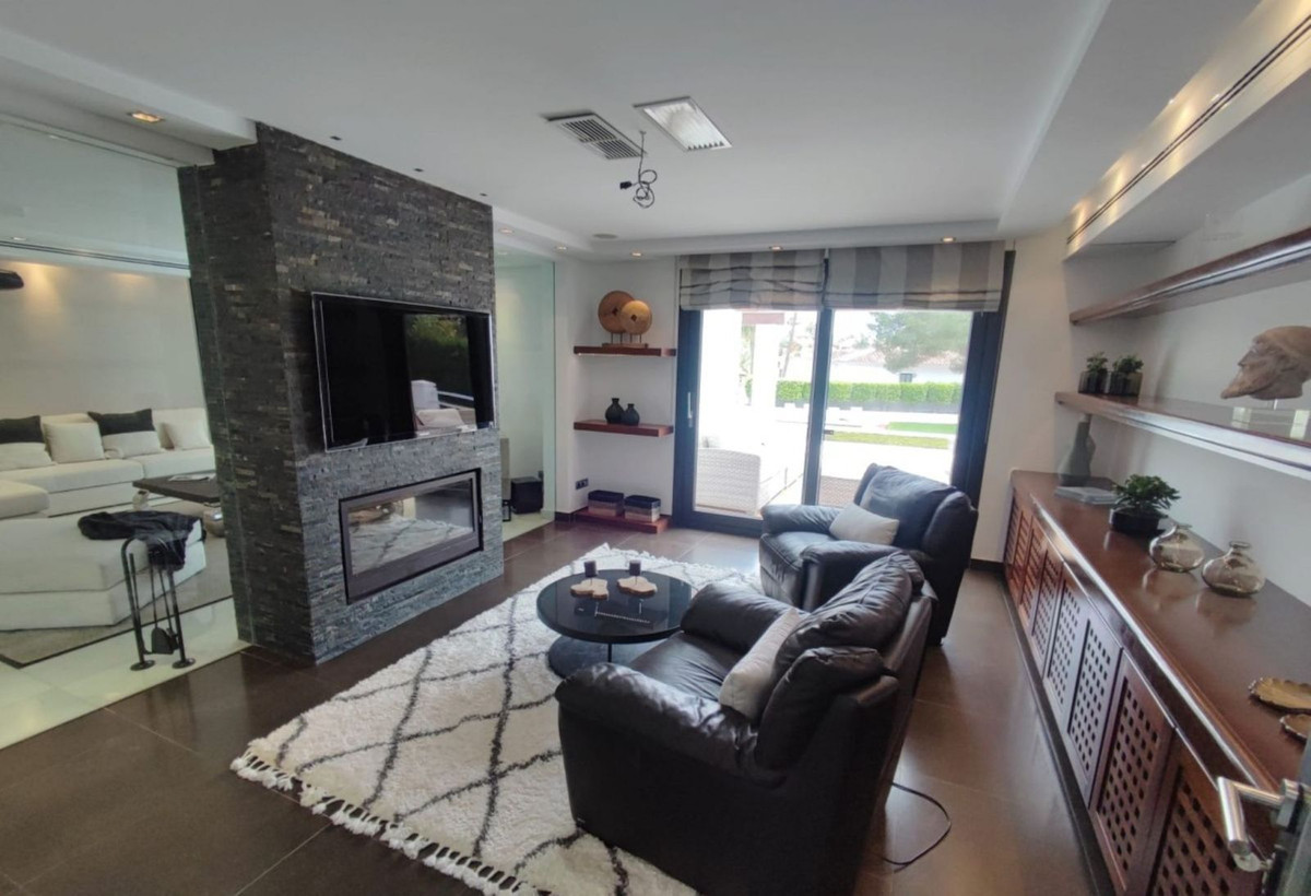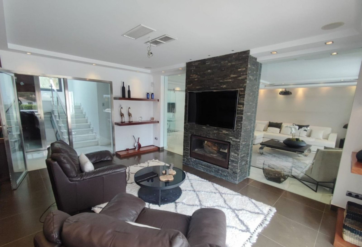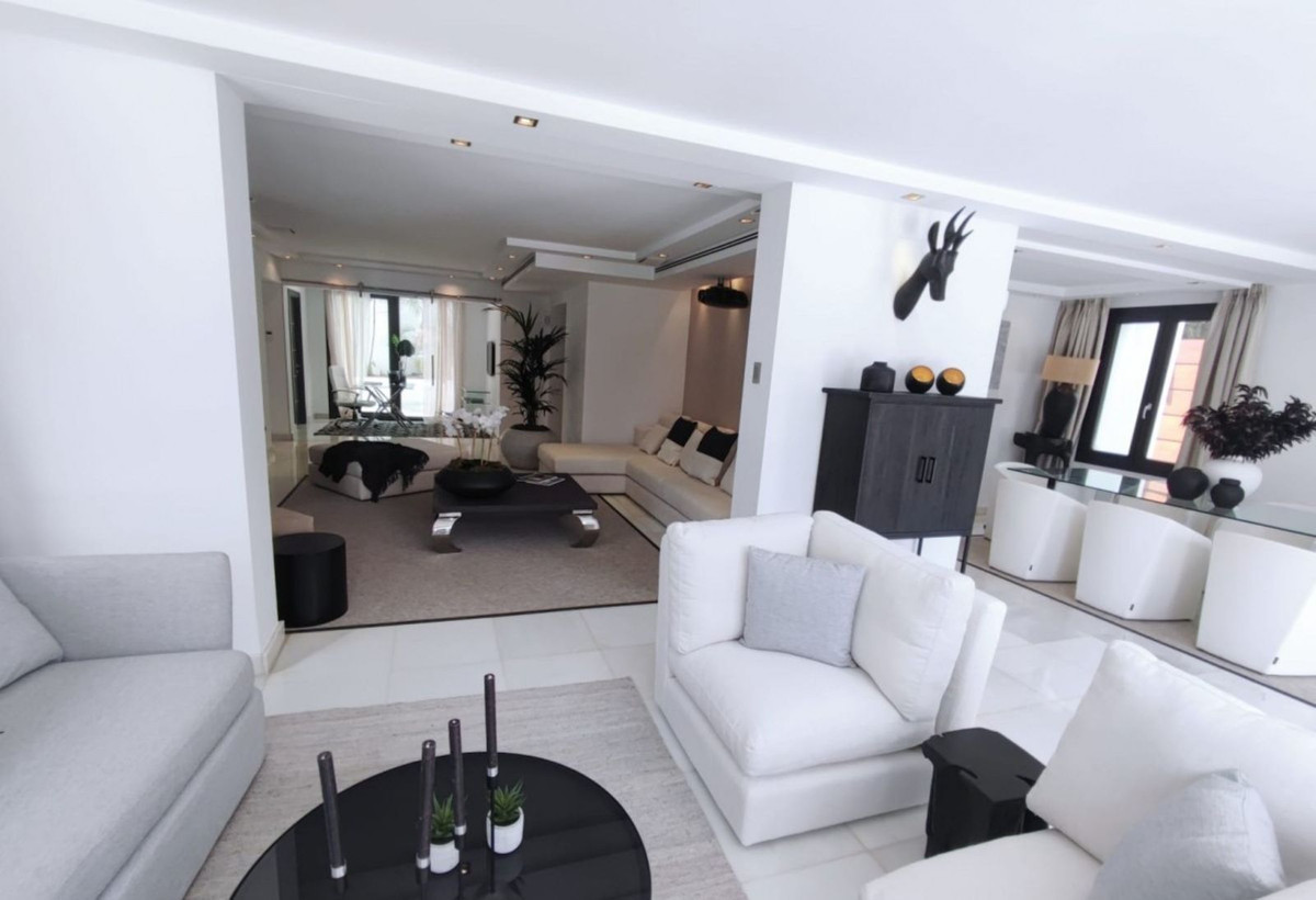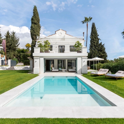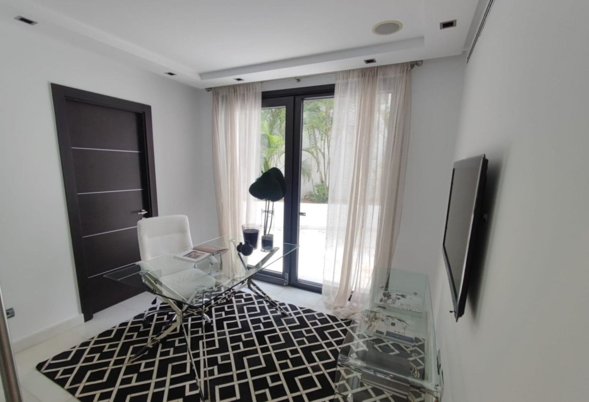 A stunning contemporary five-bedroom villa recently renovated, located just a few minutes' walk from Central Plaza and Puerto Banús. The entrance and gardens feature a serene Japanese-style water feature, leading into an open-plan foyer with a spacious reception area thoughtfully divided into a TV lounge, dining space, and a double-sided fireplace, with a private office behind a glass partition. The newly renovated kitchen is fully equipped with all modern appliances.