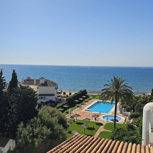 Denne ejendom ligger vest for Estepona havn og er bekvemt placeret tæt på butikker og kun et stenkast fra stranden. Ejendommen har 2 soveværelser med dobbeltsenge, der deler familiebadeværelset, et halvt åbent køkken og en stue, der åbner ud mod altanen, hvorfra man har en fantastisk havudsigt. Ved siden af køkkenet er der en lille gårdhave-terrasse med trapper op til tagterrassen, som er meget stor, og her er også et andet rum, der i øjeblikket bruges som opbevaringsrum, men som kan omdannes til et andet rum med adgang fra stuen.