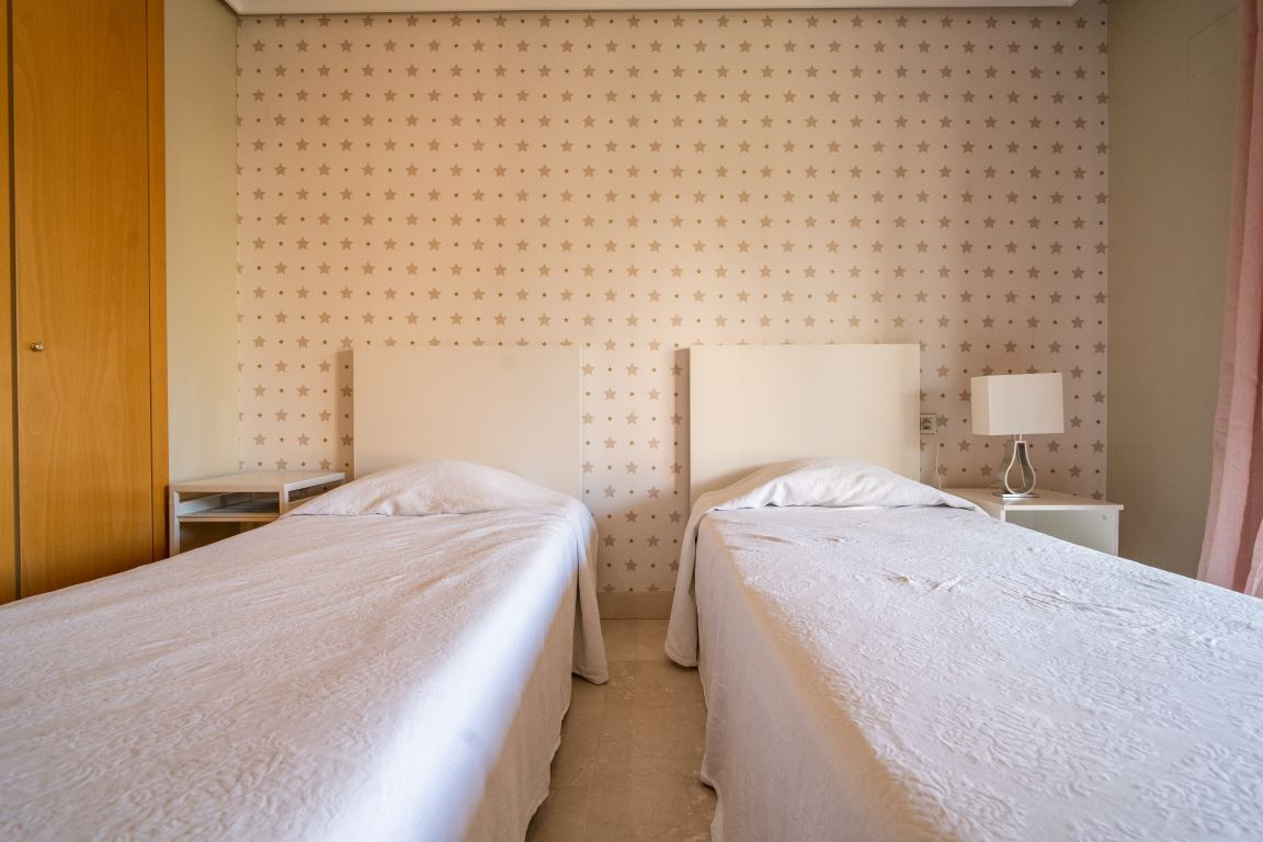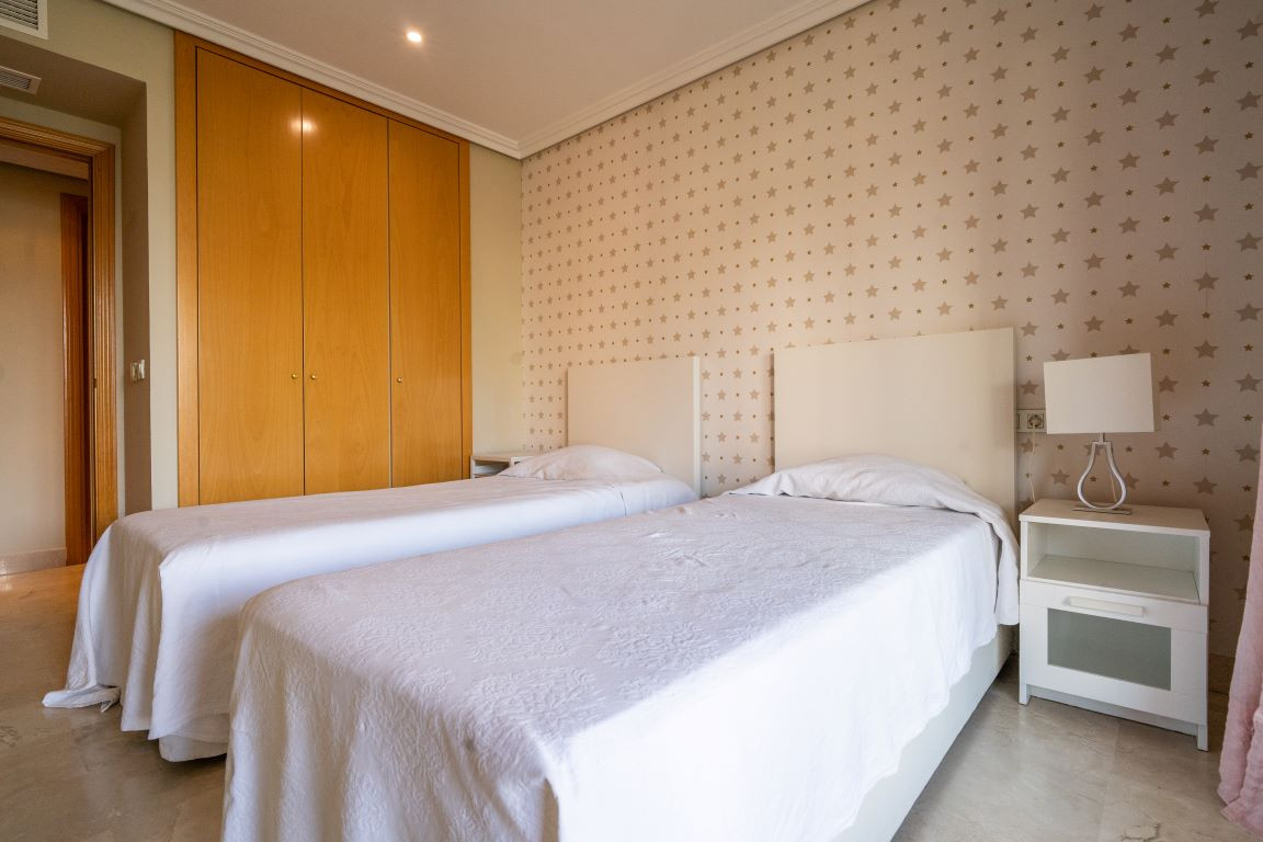 The master bedroom with en-suite bathroom includes a generous walk-in wardrobe, while the additional bedrooms and hallway feature fitted wardrobes, providing plenty of storage space. The property also comes with an underground parking space and a storage room, and the complex offers 24-hour security and concierge service, guaranteeing privacy and peace of mind.