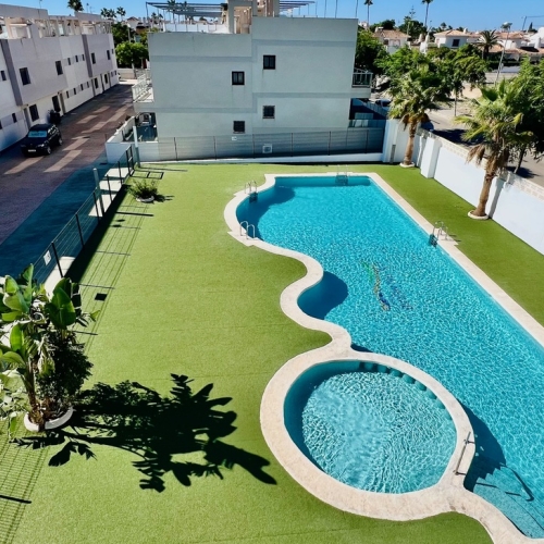 Discover this impressive duplex penthouse located in the heart of Pueblo Latino, Pilar de la Horadada. With a generous surface area of 118 m², this property features three spacious double bedrooms and two full bathrooms that guarantee comfort and privacy. Its south-facing orientation allows for all-day sunshine, creating a warm and welcoming atmosphere. The property is in good overall condition and includes multiple extras such as air conditioning for hot days, built-in wardrobes that optimize the available space, and access to well-maintained gardens. The communal pool is perfect for relaxing or socializing with neighbors while enjoying the Mediterranean climate. It also features high ceilings that visually enhance its spaciousness; from your terrace, you can enjoy unobstructed views of green garden areas. The building is equipped with a video intercom for additional security. The location is unbeatable: just a 600-meter walk from the beautiful local beaches. You'll also be surrounded by numerous amenities, including nearby shopping centers, highly accessible public and private schools, essential hospitals and medical centers, and parks where you can stroll by the sea or simply relax under the trees. For added peace of mind, there are children's areas designed especially for the little ones within a gated community equipped with parking included, making living here even better! An ideal home whether you're looking for a permanent residence or a holiday investment, given the excellent profitability of tourist rentals thanks to the growing demand in the coastal area.