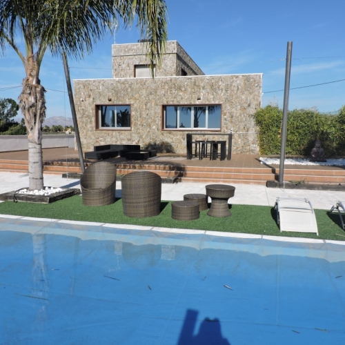 Modern finished villa in the Catral countryside.There is a living area of 147 m2, comprising three bedrooms with fitted wardrobes, two bathrooms , one of which is ensuite, a spacious living/dining room and a modern kitchen.At the front of the property there is a covered terrace and to the side a storage room located under the stairs leading to the roof terrace with views of the countryside.The property has pre-installation of air conditiong and the entrance gate can be connected to an electric motor.Located on a walled plot of 2170m2 landscaped with gravel for easy maintenance.Only minutes from the centre of Catral , 15 minutes drive to the beautiful sandy beaches of La Marina and 30 minutes to Alicante airport.
