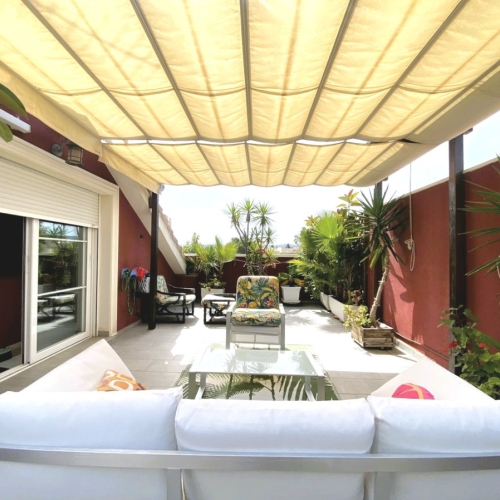 Bright and open-plan living and dining area with direct access to a large, southeast-facing terraceSun-drenched terrace—ideal for outdoor dining and soaking up the Mediterranean climateBonus loft space above the dining area, accessible by spiral staircase—perfect for a home office, playroom, or potential 4th bedroomThree spacious bedrooms and two bathrooms, including an en-suite to the masterIndependent, fully equipped kitchen with a separate utility roomAccess to a shared swimming pool and landscaped gardensPrivate parking in the underground communal garage, with additional street parking availableModern conveniences including double glazing, electric shutters (persianas), ducted hot/cold air conditioning, high-speed fibre optic internet, and a secure entry systemLocation Highlights: