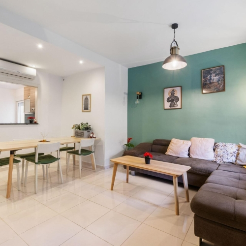 The property features two air conditioning units, a modern open-plan kitchen with dishwasher and oven, one bathroom with a premium walk-in shower, and a bright living room with a pull-out sofa. It's fully allergy-friendly, smoke-free, and fitted with unlimited Wi-Fi and a flat-screen TV. The layout comfortably accommodates up to four people and a baby.