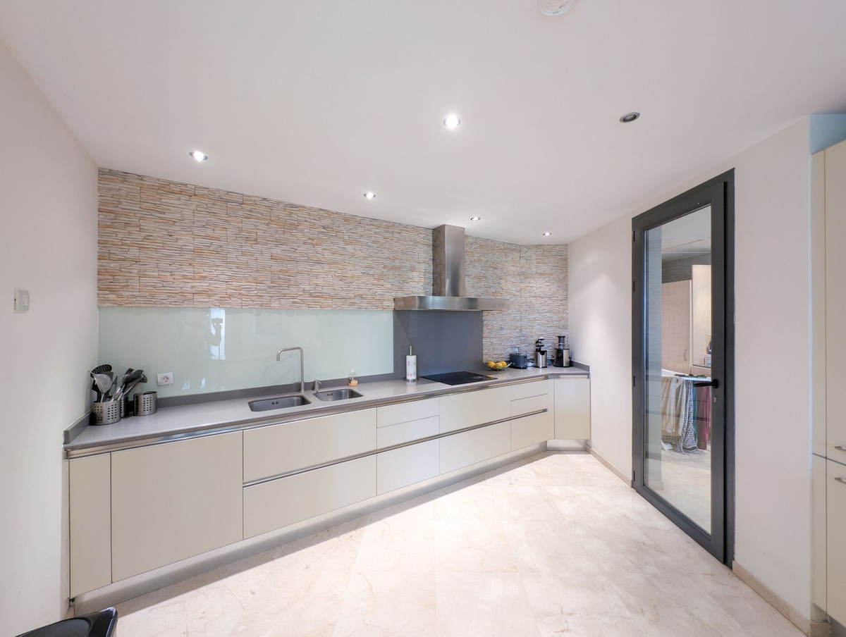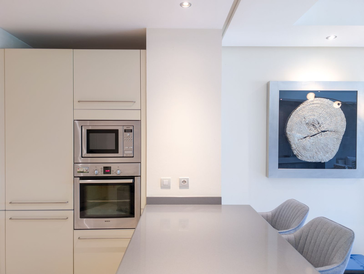 The fully equipped, modern kitchen offers premium appliances and ample storage, seamlessly combining functionality with sleek aesthetics. The master suite includes an en-suite bathroom and private access to the main terrace, offering a peaceful retreat. The second bedroom is generously sized and served by a full guest bathroom, making the layout ideal for families, guests, or home office use.