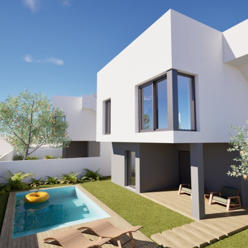 Nybyggeri med høj kvalitet, såsom hvidlakeret indvendigt tømrerarbejde, porcelænsflisegulve og aluminium udvendigt tømrerarbejde med dobbeltruder. Derudover har den ekstraudstyr som forinstallation af aircondition og opvarmning i hele huset og indbyggede skabe.