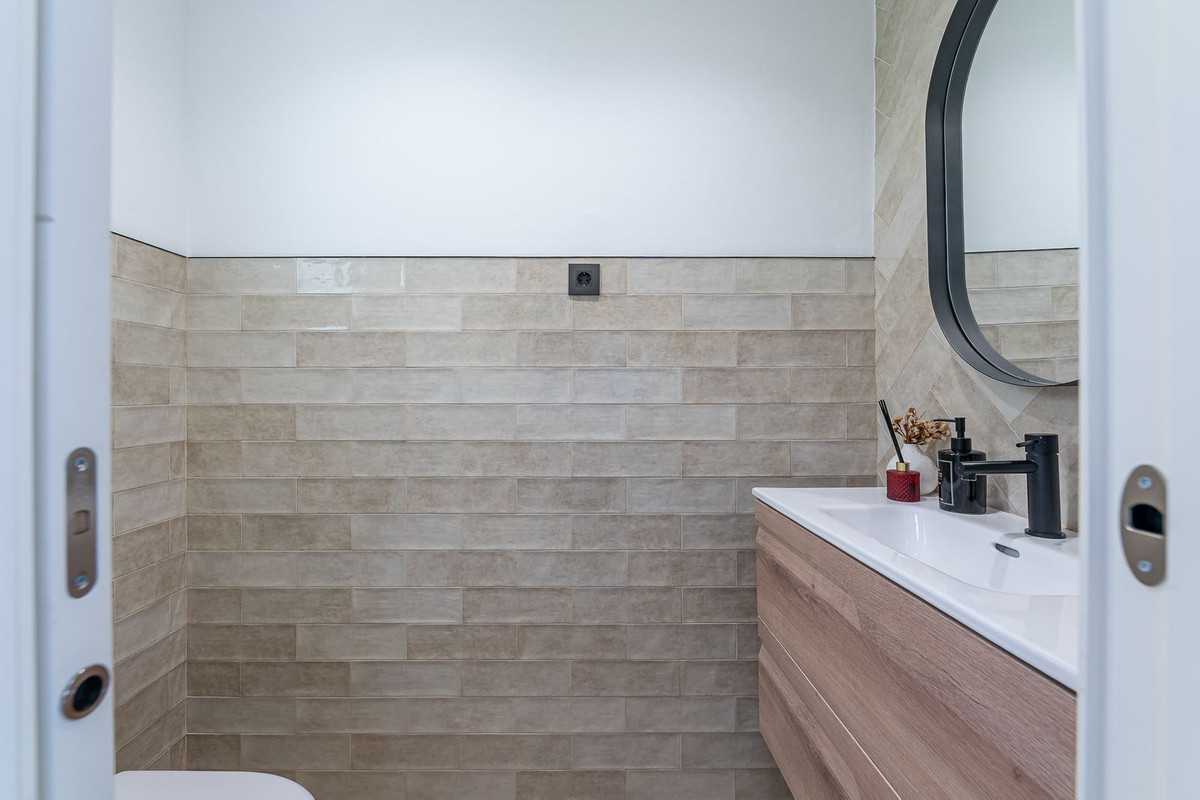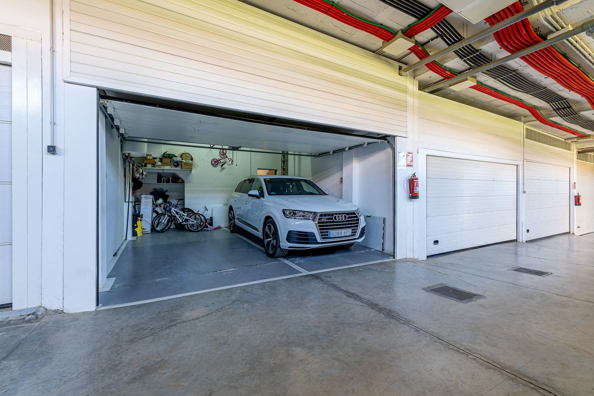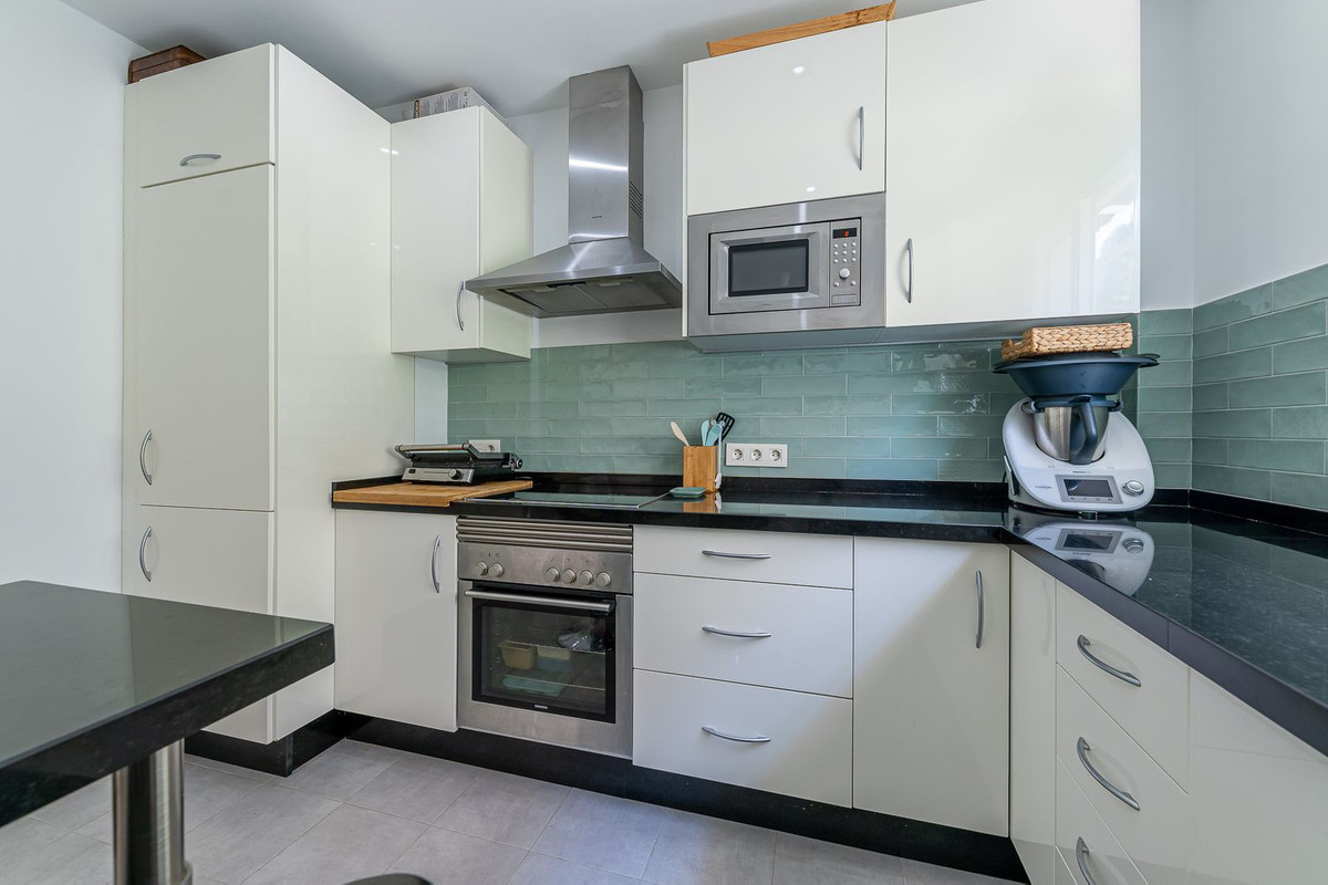 On the main floor, you'll find a fully equipped independent kitchen with a separate laundry area, and a large living-dining room with direct access to a 25 m² terrace, partially enclosed with LUMON glass curtains. From here, you can enjoy open views of green areas and the communal pools.