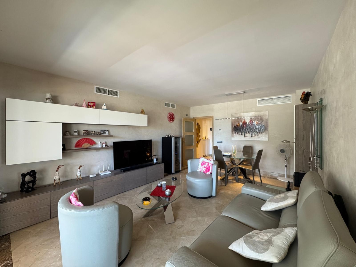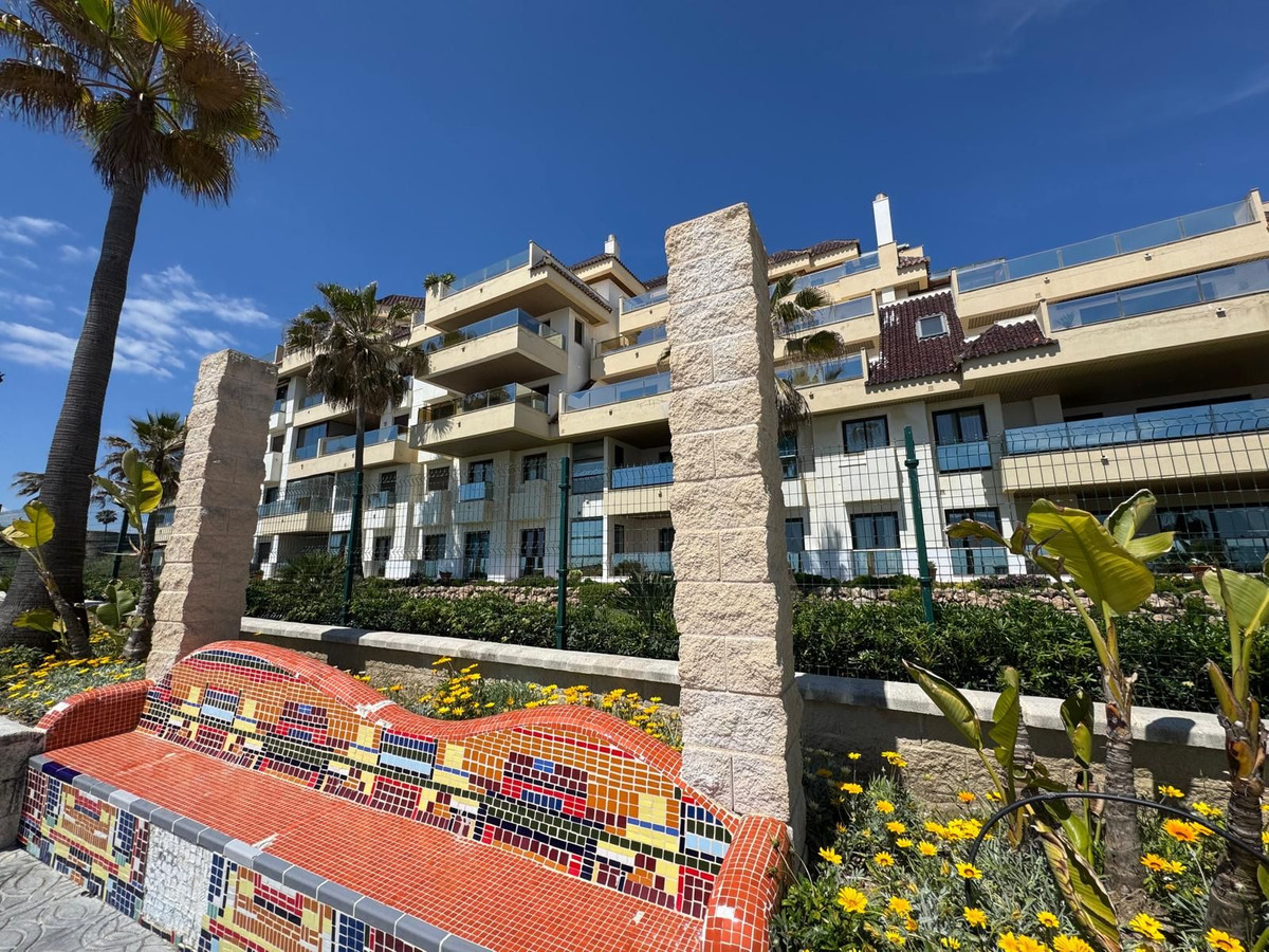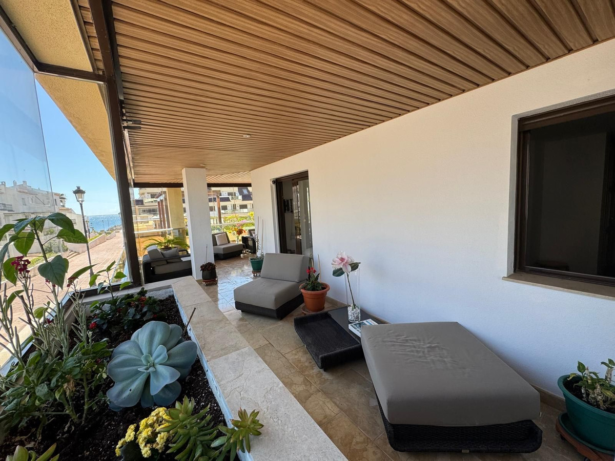 Magnificent 3 bedroom ground floor flat in the beautiful urbanisation of Marina Castillo, on the beachfront. A very nice flat, good qualities, with air conditioning hot/cold and home automation. The kitchen is independent with a small laundry room, we have 3 bedrooms with electric blinds and 2 complete bathrooms with electric towel rails, one en suite. The living-dining room, as well as the kitchen and 2 bedrooms have access to the large terrace of almost 70m2. The terrace is closed with glass curtains that allow you to enjoy your stay all day long and its corner location lets the sun in the morning until 13h but recovers it in the afternoon, a real pleasure. A quiet location, close to a rest area and with easy access to the communal swimming pool. The views are nice, some sea, garden and small Andalusian villaje complex....