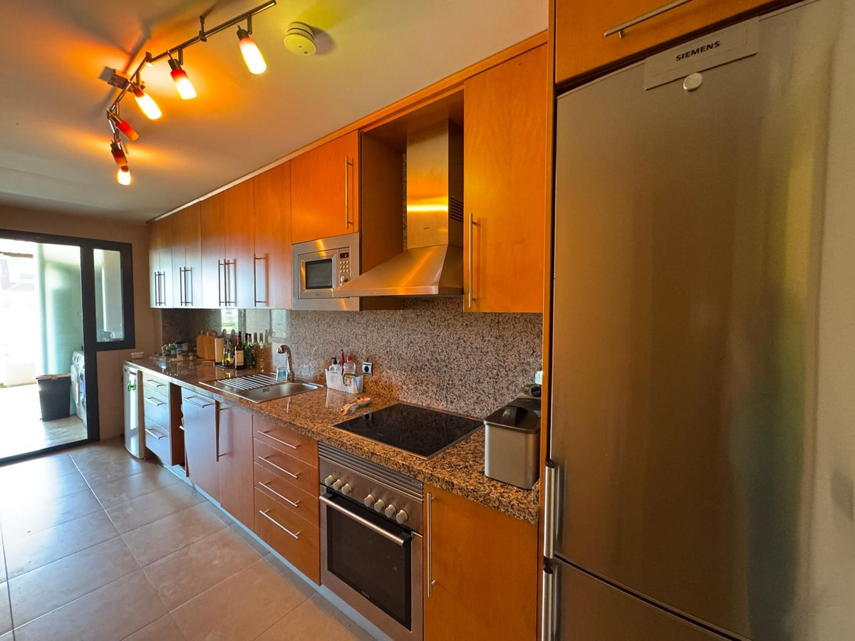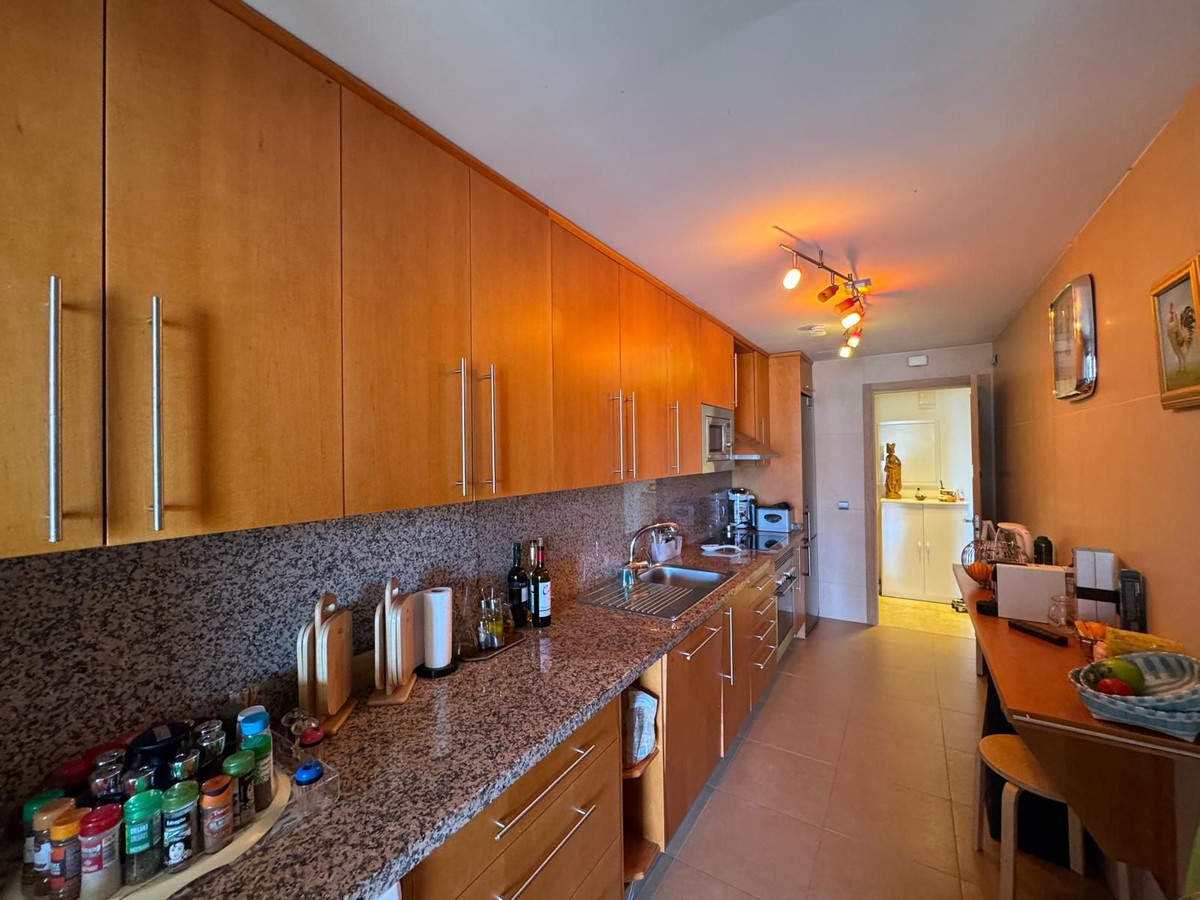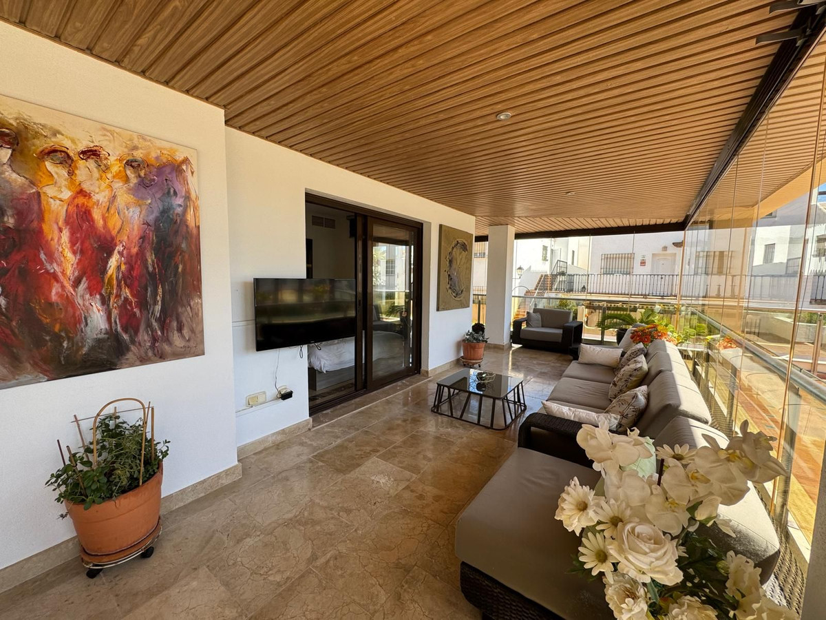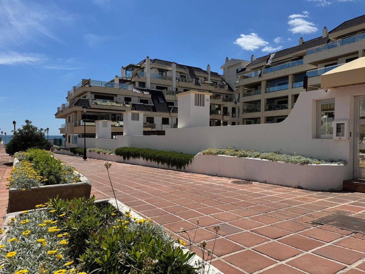 Magnificent 3 bedroom ground floor flat in the beautiful urbanisation of Marina Castillo, on the beachfront. A very nice flat, good qualities, with air conditioning hot/cold and home automation. The kitchen is independent with a small laundry room, we have 3 bedrooms with electric blinds and 2 complete bathrooms with electric towel rails, one en suite. The living-dining room, as well as the kitchen and 2 bedrooms have access to the large terrace of almost 70m2. The terrace is closed with glass curtains that allow you to enjoy your stay all day long and its corner location lets the sun in the morning until 13h but recovers it in the afternoon, a real pleasure. A quiet location, close to a rest area and with easy access to the communal swimming pool. The views are nice, some sea, garden and small Andalusian villaje complex....