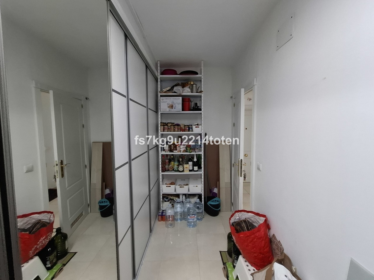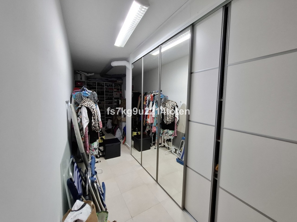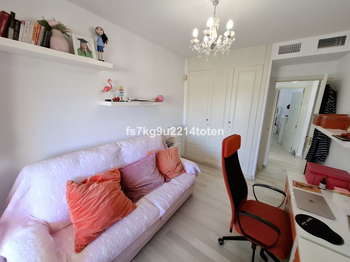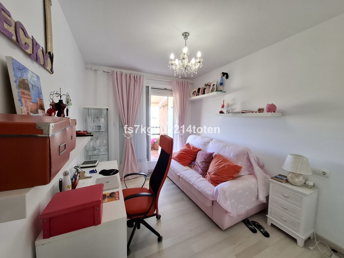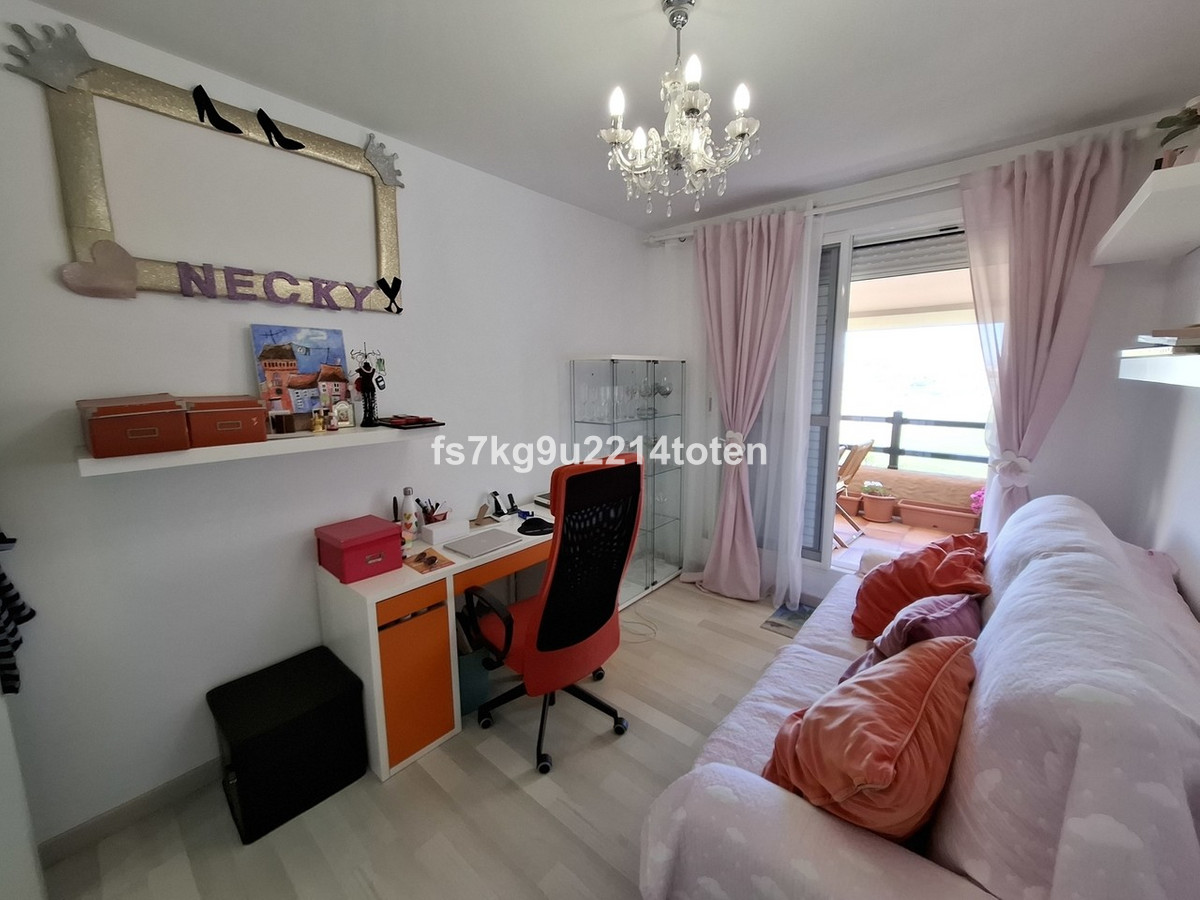 The generously sized living and dining area leads out to a private terrace, with panoramic views of the surrounding countryside, golf course, and tennis courts. The terrace is spacious, perfect for outdoor furniture, and is equipped with a toldo for shade and comfort.