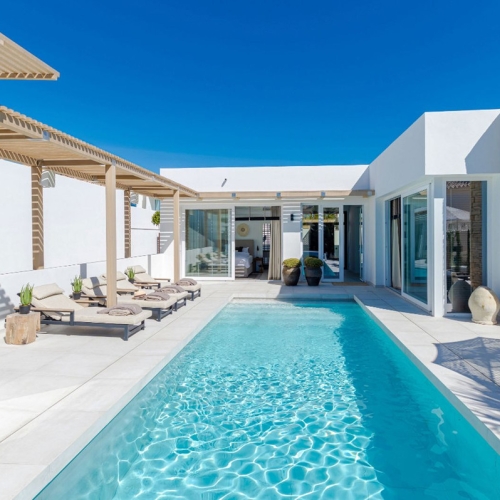 Outside, a private heated infinity pool and manicured gardens create a peaceful retreat where the green of the trees and surroundings perfectly blend in with the blue of the sea and the sky.