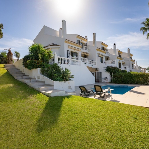 Nice townhouse on a great location with a lot of potential. You enter on the ground floor level. Here we have a semi open kitchen, living room that leads out to the sunny terrace overlooking the lush gardens. There is the master bedroom with the ensuite bathroom and a guest toilet. On the first floor you will find another 2 bedrooms and a second bathroom. Downstairs is a separate guest annex and a lovely private sunny garden. The house needs some updating and is priced to sell. The community has lush gardens and a pleasant community pool.