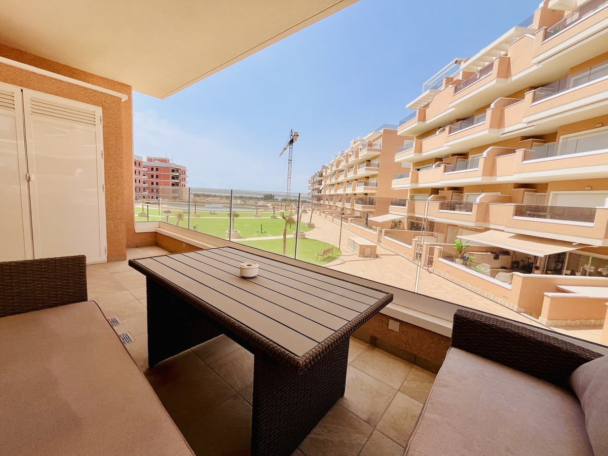 This beautiful 3-bedroom, 2-bathroom apartment in the sought-after Residencial Vista Azul XXXII, El Raso, is an opportunity not to be missed. Perfectly located in the charming area of Guardamar, right next to the well-known Lagunas Park in La Mata, it offers the ideal combination of modern living, comfort, and convenience. Fully furnished and finished to a high standard, it features a bright open-plan living and dining area, a stylish kitchen, and spacious bedrooms. The master bedroom benefits from its own en-suite bathroom for added privacy and convenience. The property is also equipped with electric blinds throughout, adding a modern touch and extra comfort.Set within a fantastic gated community, the property boasts a communal pool, indoor heated pool, children's playground, and a putting area, providing everything you need for both year-round living or unforgettable holidays. From the apartment, you can enjoy outstanding views across the nearby salt lakes, creating a peaceful and scenic backdrop, perfect for relaxing sunsets and nature lovers. A private garage space is included, and it's located just 11km from the beautiful sandy beaches of Guardamar, with Alicante Airport only a 25-minute drive away. An exceptional, ready-to-move-in home in the sun, surrounded by nature, views, and excellent local amenities.