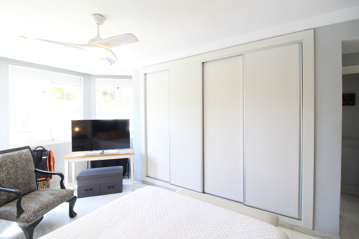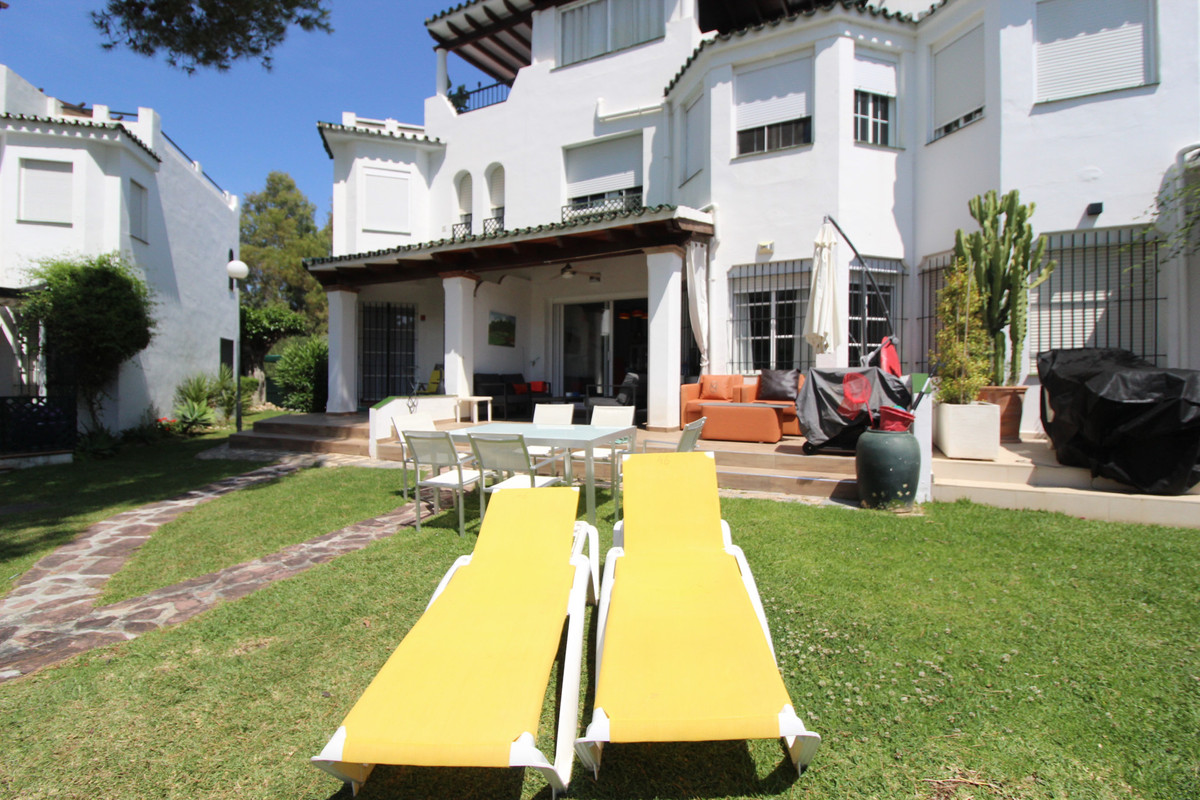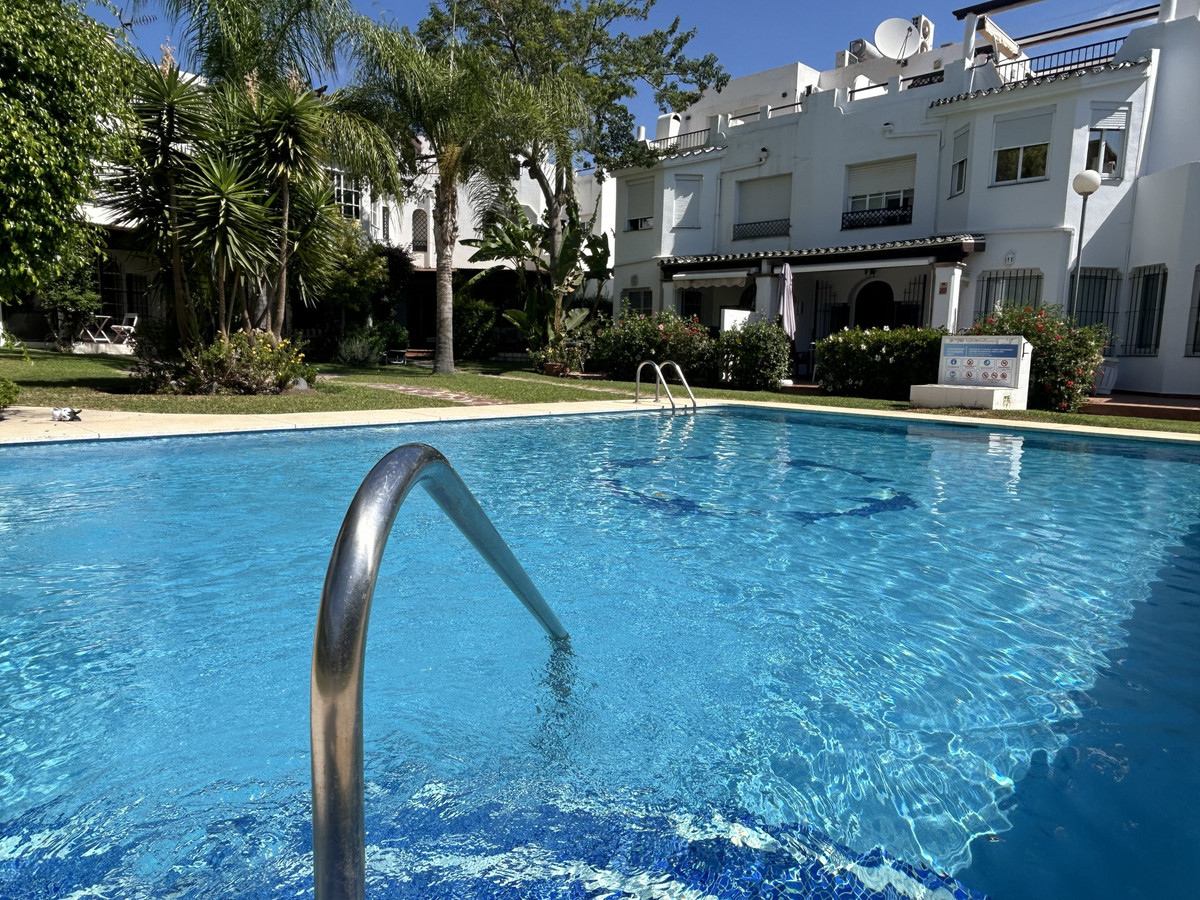 Beautiful townhouse in frontline golf urbanization; it consists of several swimming pools and large landscaped areas. It is a closed and very careful community. Renovated Porches, Solarium , Wardrobes, Bathrooms. The wooden roof is of high quality It has on the ground floor entrance hall, large renovated kitchen and full guest bathroom, living room with fireplace and exit to the terrace with porch and views to the pool of this phase. It also has great porch to the north east at the entrance to the ideal house for sunny days and to be at the frequito. Enjoy the communal garden from the porch of the living room On the first floor the 3 bedrooms and 2 bathrooms, one of them ensuite with shower. New fitted wardrobes in all bedrooms. On the second floor large solarium with new wooden porch. Ideal for chill out area and outdoor dinners with barbecue and closed part as well as laundry room. The fantastic panoramic views to the entire grove area and La Quinta mountains. The urbanization is close to everything: Supermarkets, Colleges, Shops, Restaurants etc.. is ideal for Holidays or for families. And perfect to live all year. It has general air conditioning throughout the house and blinds. San Pedro de Alcantara is a 4-minute drive from Puerto Banus. It is for all an ideal house