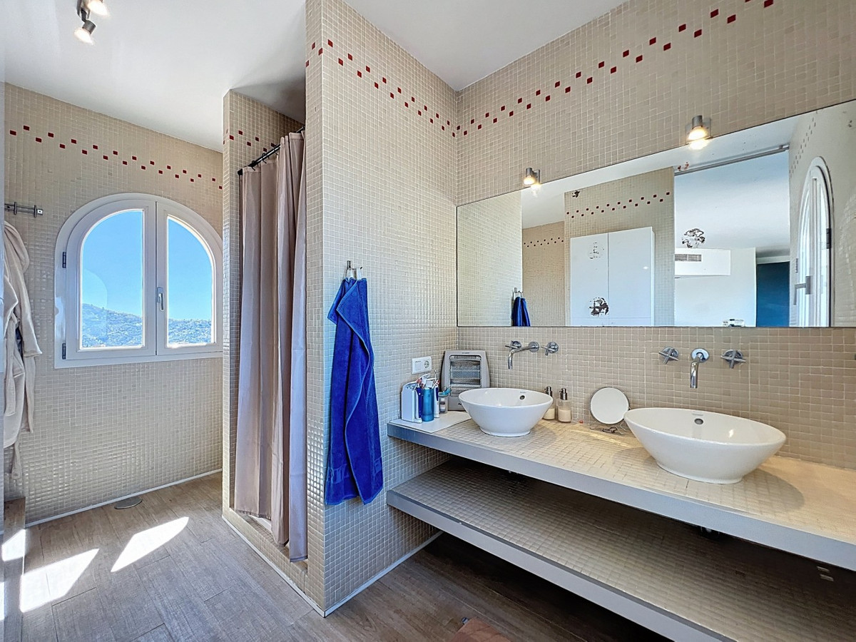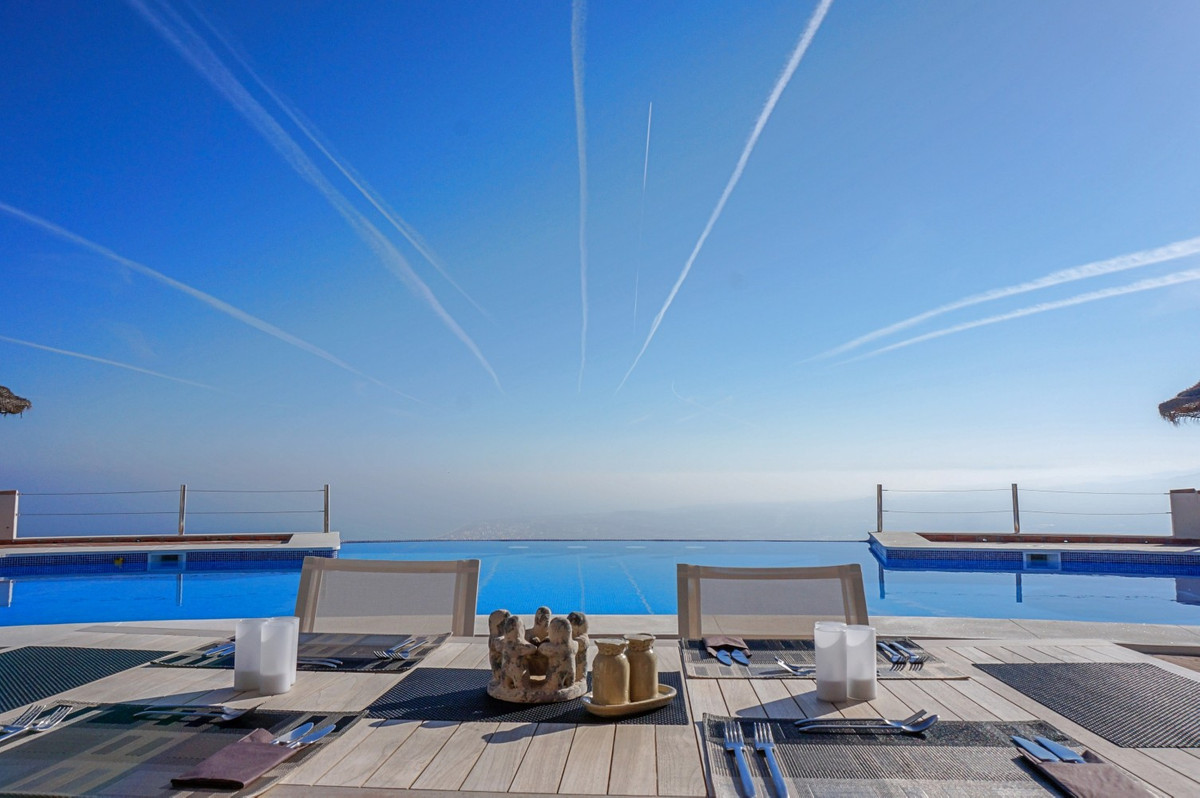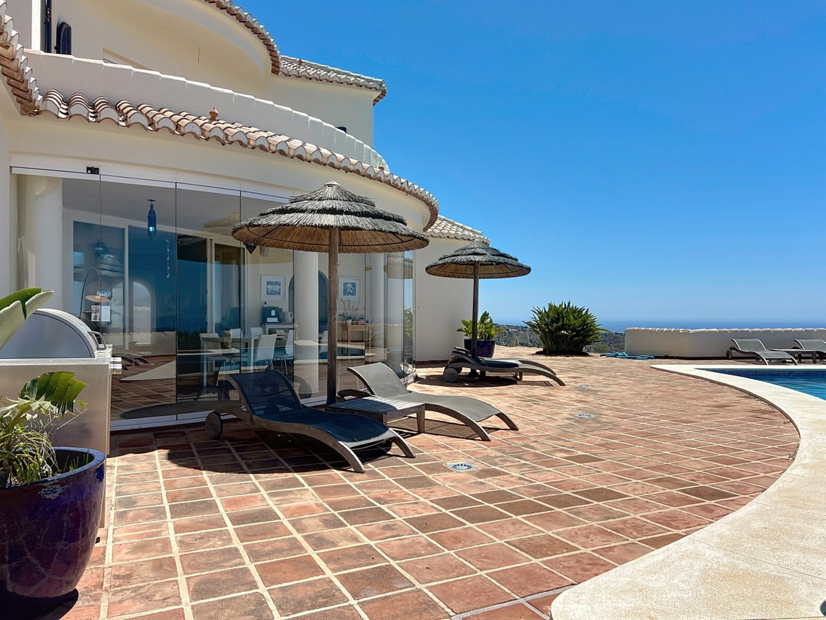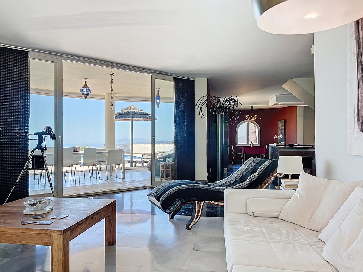 Forestil dig at vågne op hver dag til Middelhavets beroligende omfavnelse i denne udsøgte villa. Dette hjem er et sandt arkitektonisk mesterværk og tilbyder en uovertruffen livsstil, der problemfrit kombinerer rummeligt interiør med ærefrygtindgydende udsigter, der strækker sig helt til horisonten. Opholdsstuen byder dig velkommen med en overflod af naturligt lys takket være gulv til loft glasskydedøre, der perfekt indrammer den fascinerende udsigt over det azurblå hav. Det åbne design skaber et ideelt flow til både intime sammenkomster og storslået underholdning, der udvisker grænserne mellem indendørs luksus og udendørs paradis. For den kulinariske entusiast er gourmetkøkkenet en drøm, der går i opfyldelse, udstyret med topmoderne apparater og rigelig plads til at skabe mindeværdige måltider. Spis under åben himmel på den store terrasse, hvor den blide havbrise forstærker hvert øjeblik. Den overdådige mastersuite på 32,5 m2 tilbyder et roligt tilflugtssted med panoramaudsigt over havet. Start din dag i det spa-lignende badeværelse, et sandt vidnesbyrd om luksus og komfort. Den private balkon er ideel til at nippe til morgenkaffen eller nyde en aftencocktail, mens du ser solen dykke ned i havet.  Udenfor er den terrakottabelagte udendørs terrasse din personlige oase. Nyd den varme spanske sol, vær vært for uforglemmelige fester, eller fortab dig i den fascinerende udsigt over kysten. Ud over skønheden tilbyder denne villa en sjælden mulighed for dem, der ønsker at starte en virksomhed, som et B&B. Med 4 udlejningsværelser, hver med eget badeværelse og indgang, er ejendommen allerede blevet drevet med succes som et B&B, der kun har modtaget strålende anmeldelser. Ud over udlejningsværelserne er der et privat soveværelse på første sal med eget badeværelse og et andet soveværelse med badeværelse i kælderen. Det fuldt udstyrede køkken indeni og det vidunderlige udekøkken giver alle de nødvendige faciliteter til at drive en succesfuld virksomhed, mens den store underjordiske garage giver masser af plads til opbevaring. Denne ejendom ligger i Algarrobo, Málaga, og sikrer nem adgang til faciliteter i verdensklasse, uberørte strande og rige kulturelle oplevelser, alt imens den tilbyder de perfekte omgivelser til at forkæle sig selv med middelhavslivet. Uanset om du leder efter et luksuriøst familiehjem, en forretningsmulighed eller blot et stykke paradis, leverer denne villa på alle fronter. Dette er mere end bare et hjem; det er en livsstil. Omfavn toppen af middelhavslivet i denne ekstraordinære villa - din drøm om at eje et stykke paradis er nu inden for rækkevidde. Gå ikke glip af chancen for at løfte dit liv til nye højder af luksus, skønhed og muligheder. Vi er glade for snart at kunne præsentere denne drømmeejendom for dig, enten personligt eller via virtuel visning. Fordi denne verden er unik - ligesom vores Axarquía. I Andalusien. På Costa del Sol. Her, på livets solside...