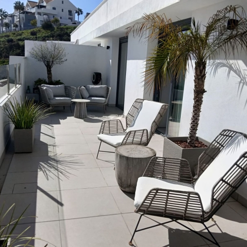 Fantastic 3 bedroom 2 bathroom penthouse only 11 minutes walk to La Cala beach. Located in the sought after Angel de Miraflores urbanization, this lovely penthouse also has a 70m2 solarium with stunning 360 degree views to enjoy all year round. Internally the property comprises of an lounge/dining room with direct access to the terrace, a semi-open plan kitchen, three double bedrooms, a bathroom and a shower room. From the lounge terrace you have access to the large solarium via a spiral staircase and once on the solarium you can enjoy views in all directions, open and covered seating areas and a sunbathing area. Power and water are supplied to the solarium making it easy for you to create an expansive outdoor living area. Included in the price is a secure, underground parking space and a generous storage room. There are a total of three swimming pools in this community, two large pools and a children's pool. One swimming pool is conveniently located directly behind the block of this penthouse. Lift access from the underground parking area and pedestrian entrance further enhance the appeal of this property.