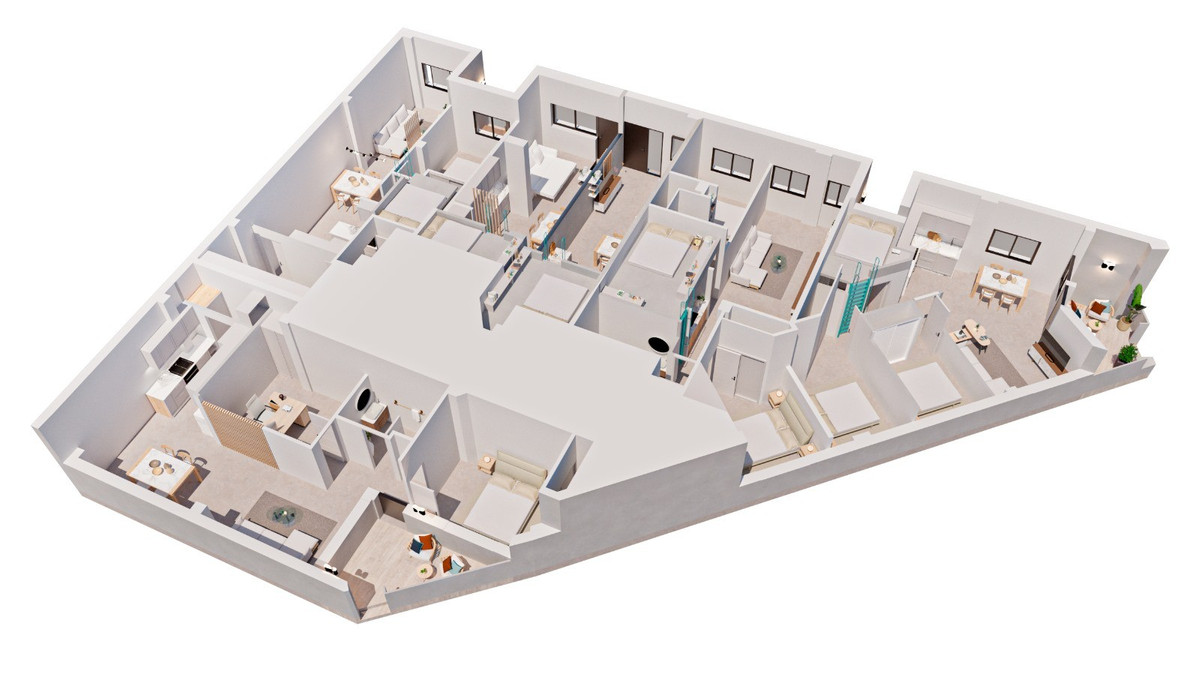 Hver lejlighed har et smart indrettet soveområde i hems-stil til gæster eller familiemedlemmer og leveres fuldt møbleret med installeret aircondition.