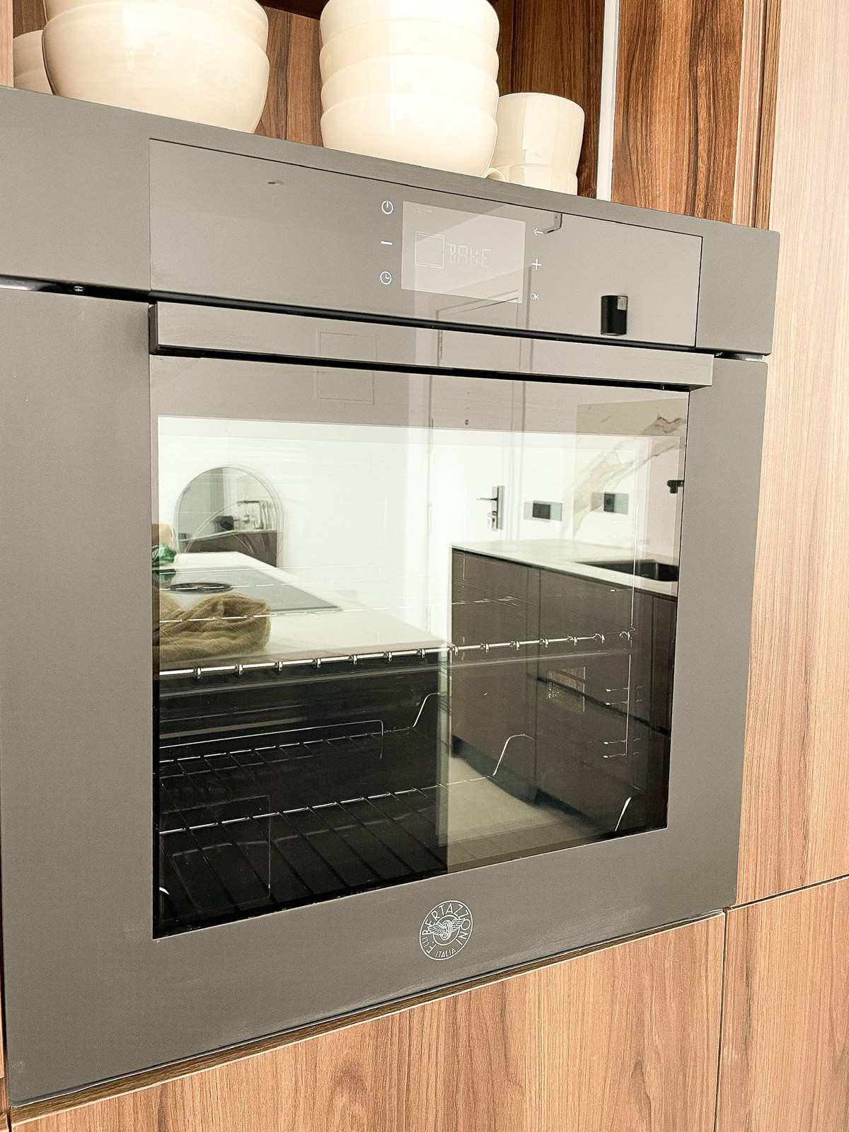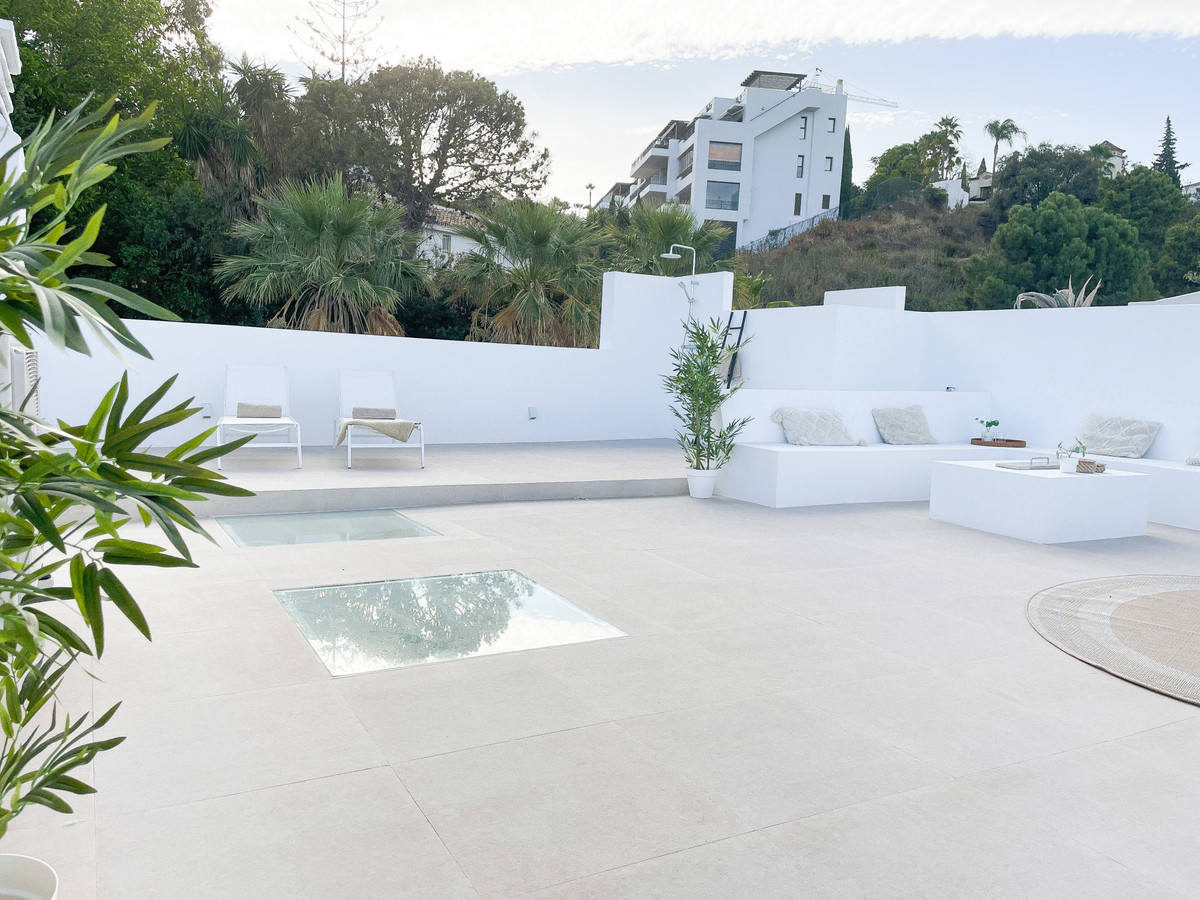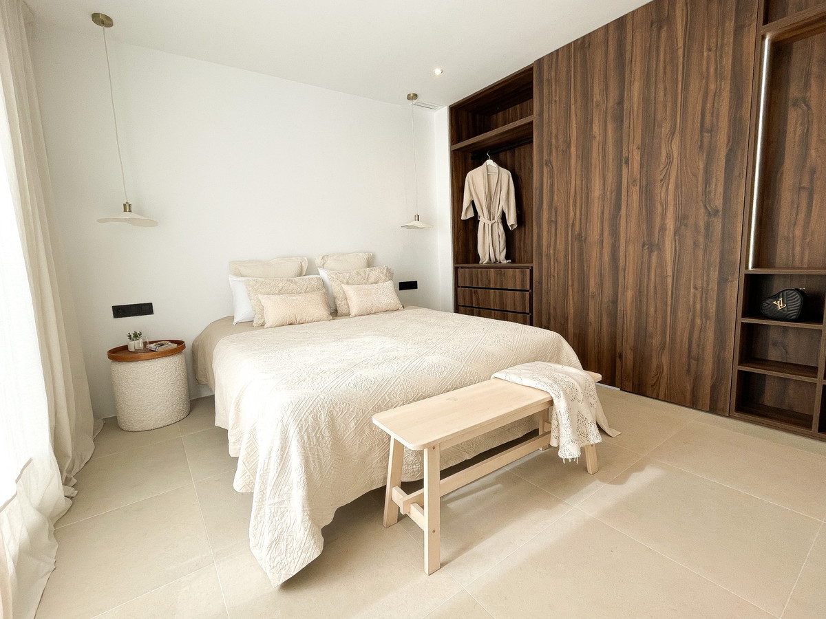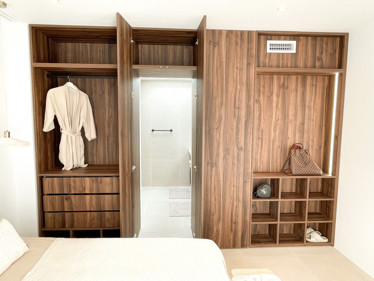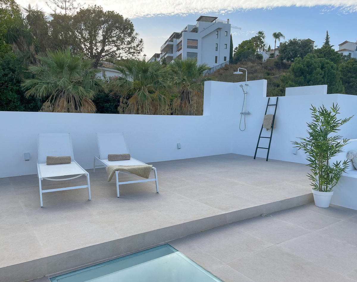 The custom kitchen features a nicely contoured island and top-of-the-line Bertazzoni appliances. The bathroom walls and outdoor areas are covered with 60x60 beige porcelain tiles, which are used throughout the design to provide coherence. The two bathrooms' sleek black features and skylights give them the ideal modern touch, and you can truly live comfortably in the sun here.