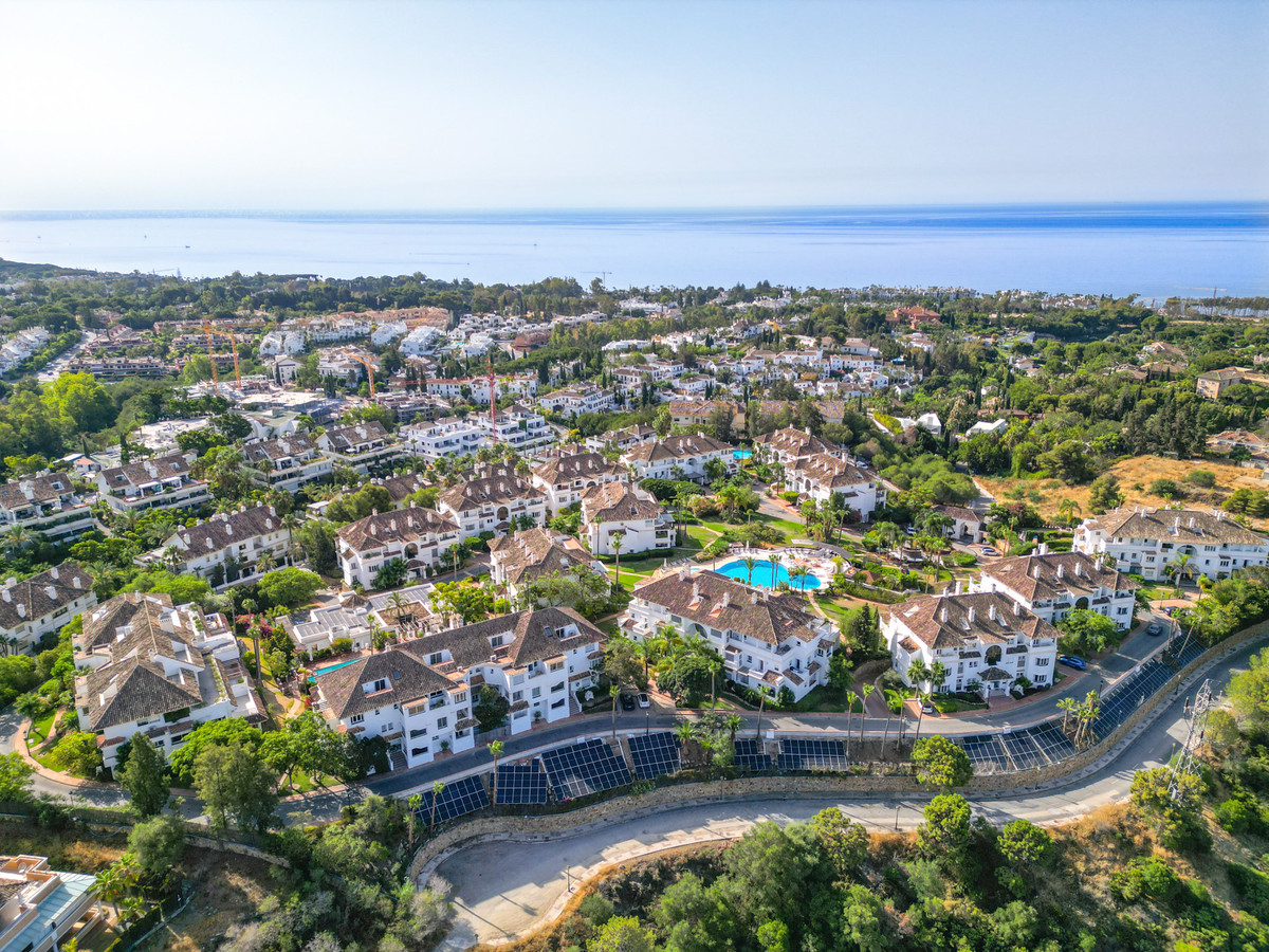 Dejlig tre værelses, syd østvendt duplex penthouse i det eksklusive og gated fællesskab af Monte Paraiso på Golden Mile, med 24 timer sikkerhed, flere udendørs swimmingpools, en bar/restaurant, børns spilleområde, fuldt udstyret fitnesscenter, dampbad, sauna, squashbane, massagerum, indendørs opvarmet swimmingpool og tropiske haver, der vedligeholdes til de højeste standarder. Derudover er det kun en kort gåtur til den berømte Puente Romano Hotel og stranden. Ejendommens vigtigste niveau har en stor stue og spiseplads med terrassedøre, der fører ud til den rummelige terrasse med fantastisk havudsigt; et fuldt udstyret køkken med separat bryggeværelse; to værelser, en med en privat terrasse med fantastisk udsigt til La Concha bjerget; og et gæsteværelse. Det øverste niveau fører til master suite med hvælvede lofter, Jacuzzi bad og adgang til en privat terrasse med spektakulær havudsigt. Andre funktioner omfatter marmorgulve, pejs, indbyggede garderobeskabe, varm og kold aircondition, to private parkeringspladser og et opbevaringsrum.