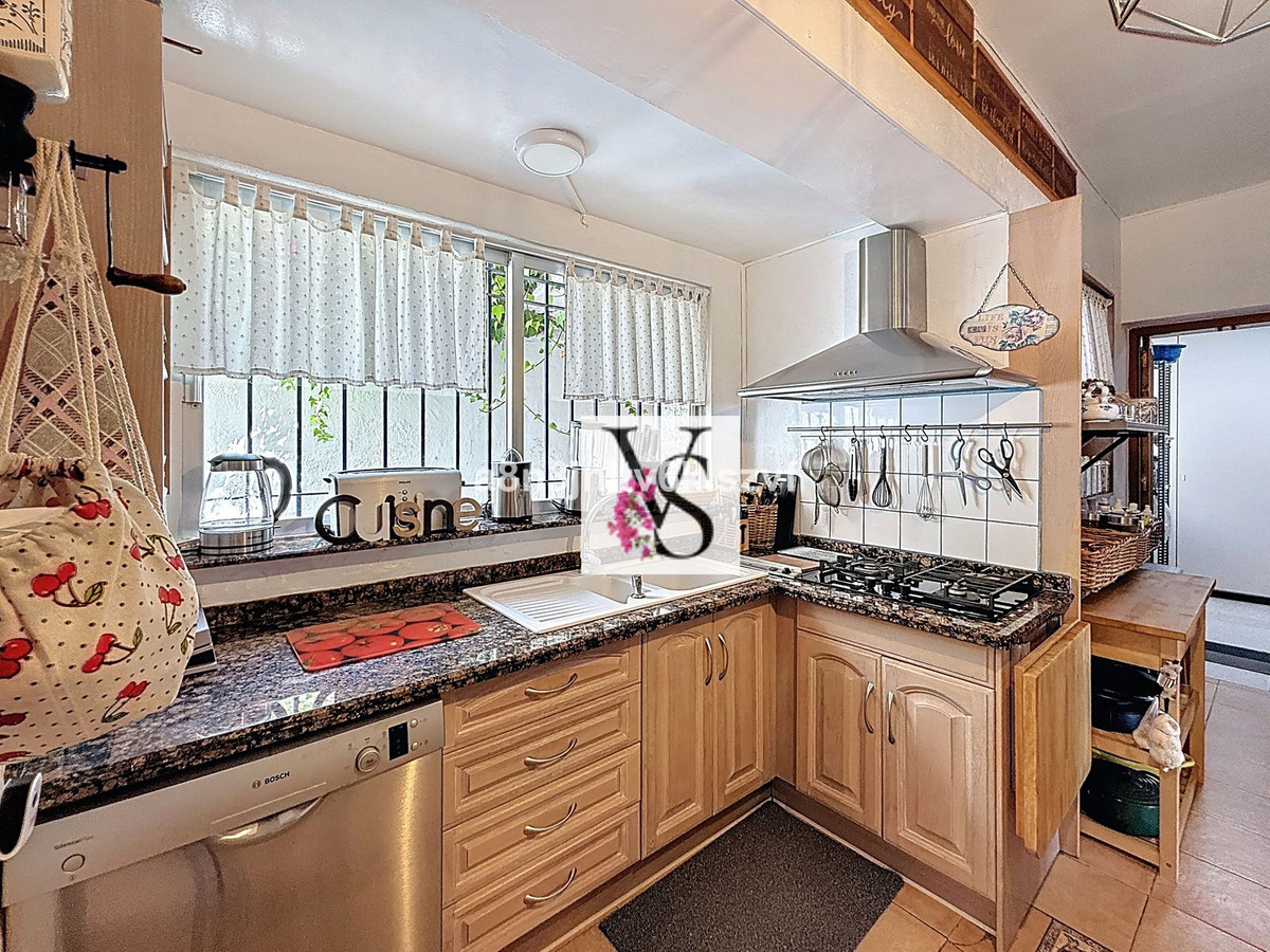 Hovedboligen har tre soveværelser (hvoraf det ene i øjeblikket fungerer som kontor), to stilfulde badeværelser, et charmerende landligt køkken, en hyggelig stue med adgang til solterrasserne, et separat vaskerum og et rummeligt opbevaringsrum (trastero).