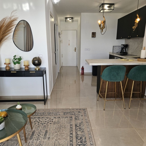 The flat consists of open kitchen-living-dining area, a bedroom, a bathroom and a terrace with sea-views. It's located on the 2nd floor with the elevator. Closed urbanization with 2 community pools and 24 hour surveillance. The underground parking space and a storage room included in the price.