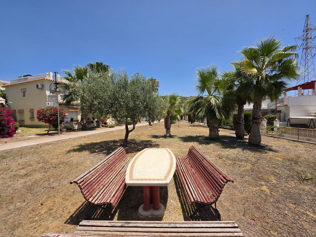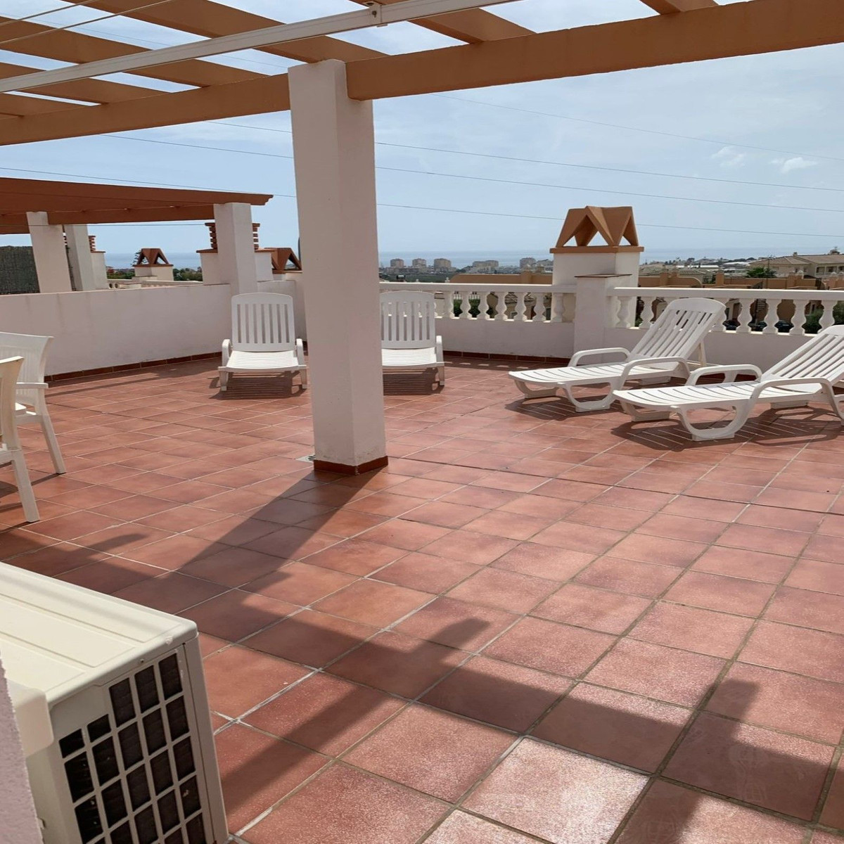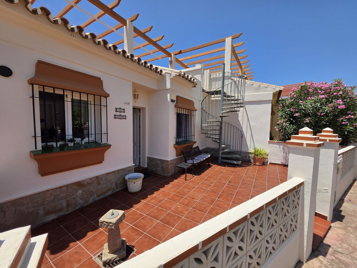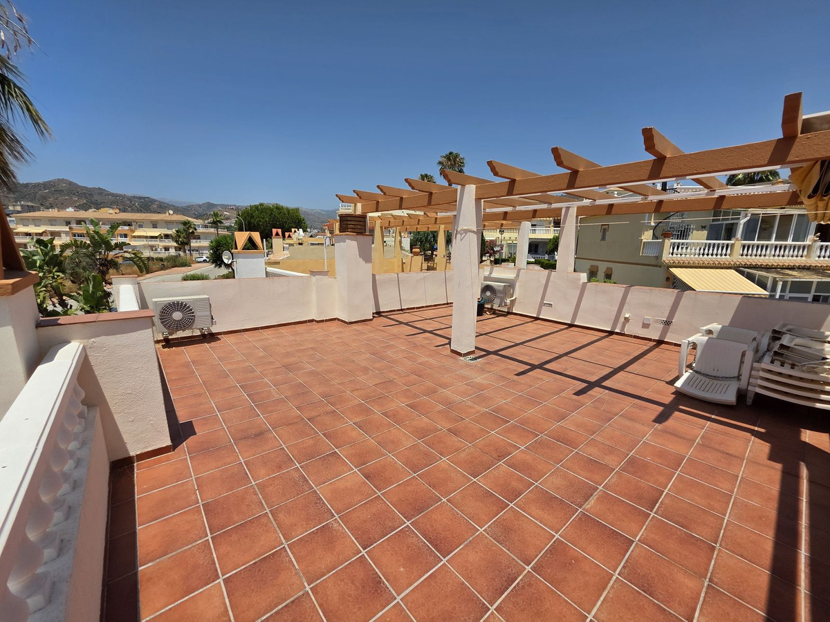 Great location of this townhouse in Torrox Costa, close to the beach and to all amenities. Also a public school is just a few minutes away. The townhouse offers a patio at the entrance, a large terrace at the back and a large roof top terrace with spectacular sea views along the coast. Overall you find two bedrooms, one full bathroom, an open kitchen with all electric appliances, a dining area and a large living room with access to the private terrace and communal garden. Facing south west with views along the coast! This townhouse is part of a community in Torrox Park which offers gardens all around and a large swimming pool area. About 30 minutes from the Málaga airport and city and only 10 minutes to the famous village of Nerja. The m2 are as followed, 70m2 living area, 16m2 terrace, 55m2 roof top terrace and 4m2 staircase!
