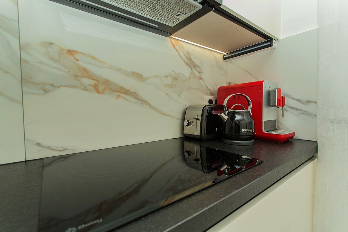 99 m², 2 bedrooms, 1 bathroom, central A++ air conditioning (mobile control), underfloor heating, and acoustic insulation.