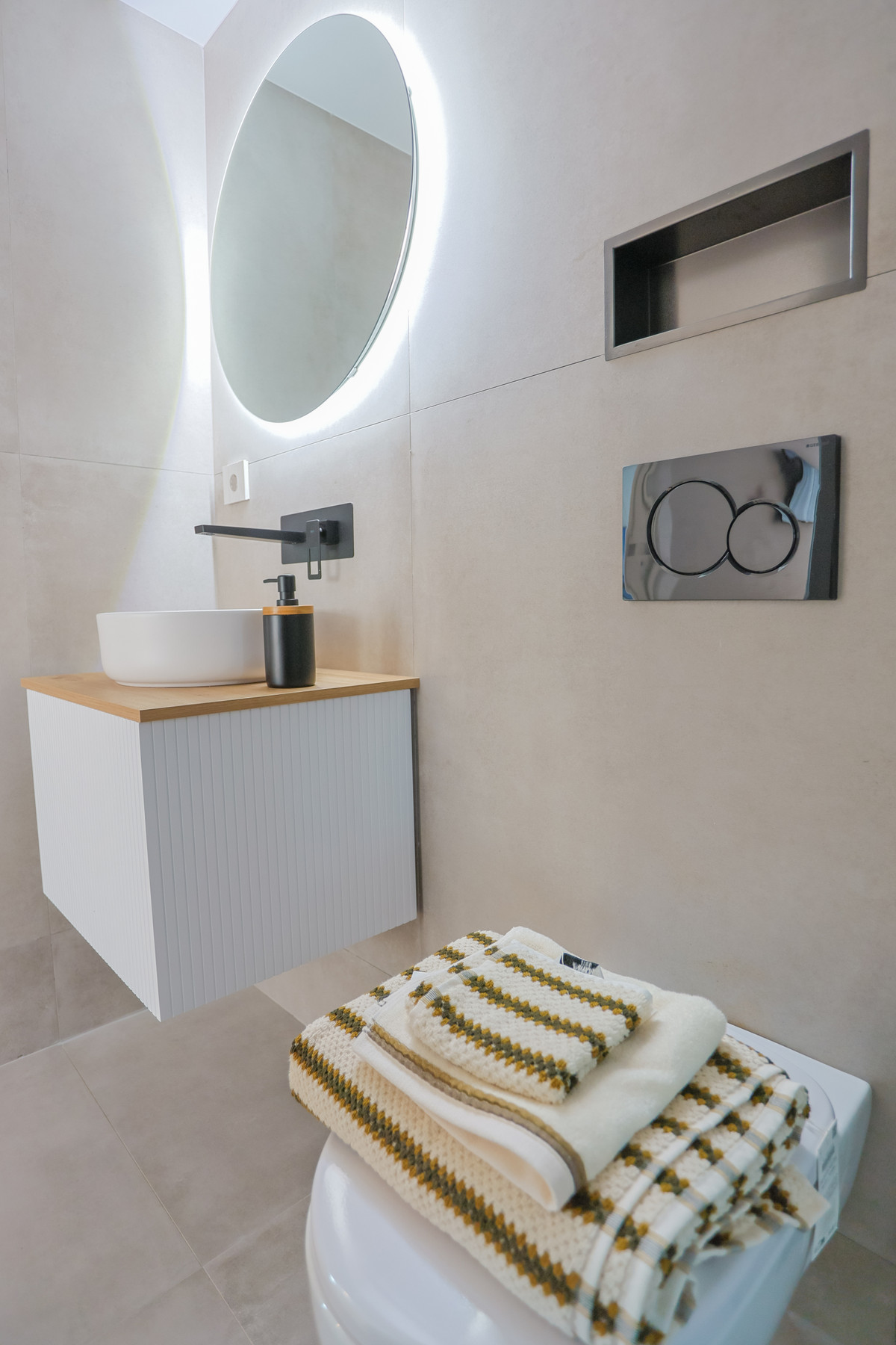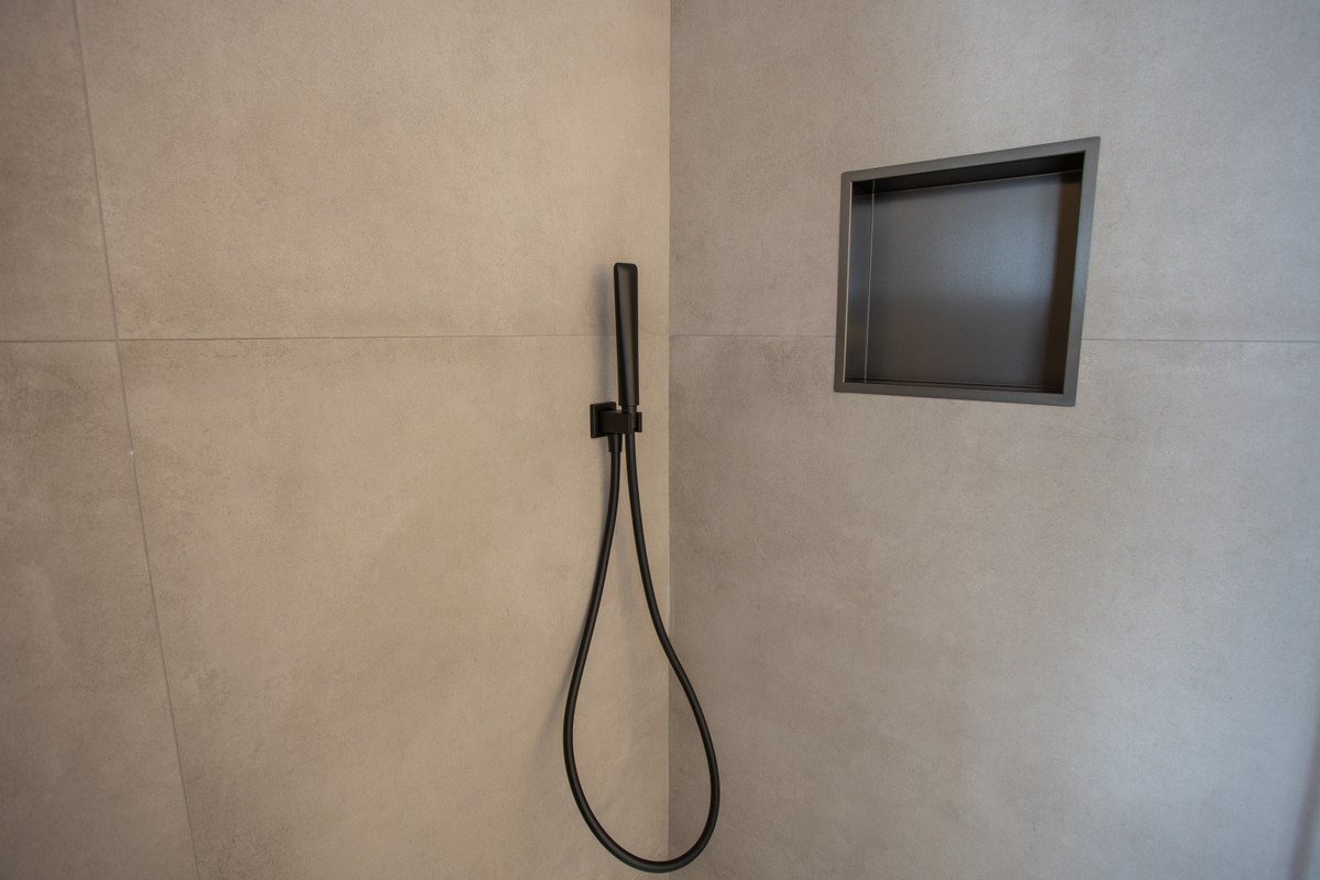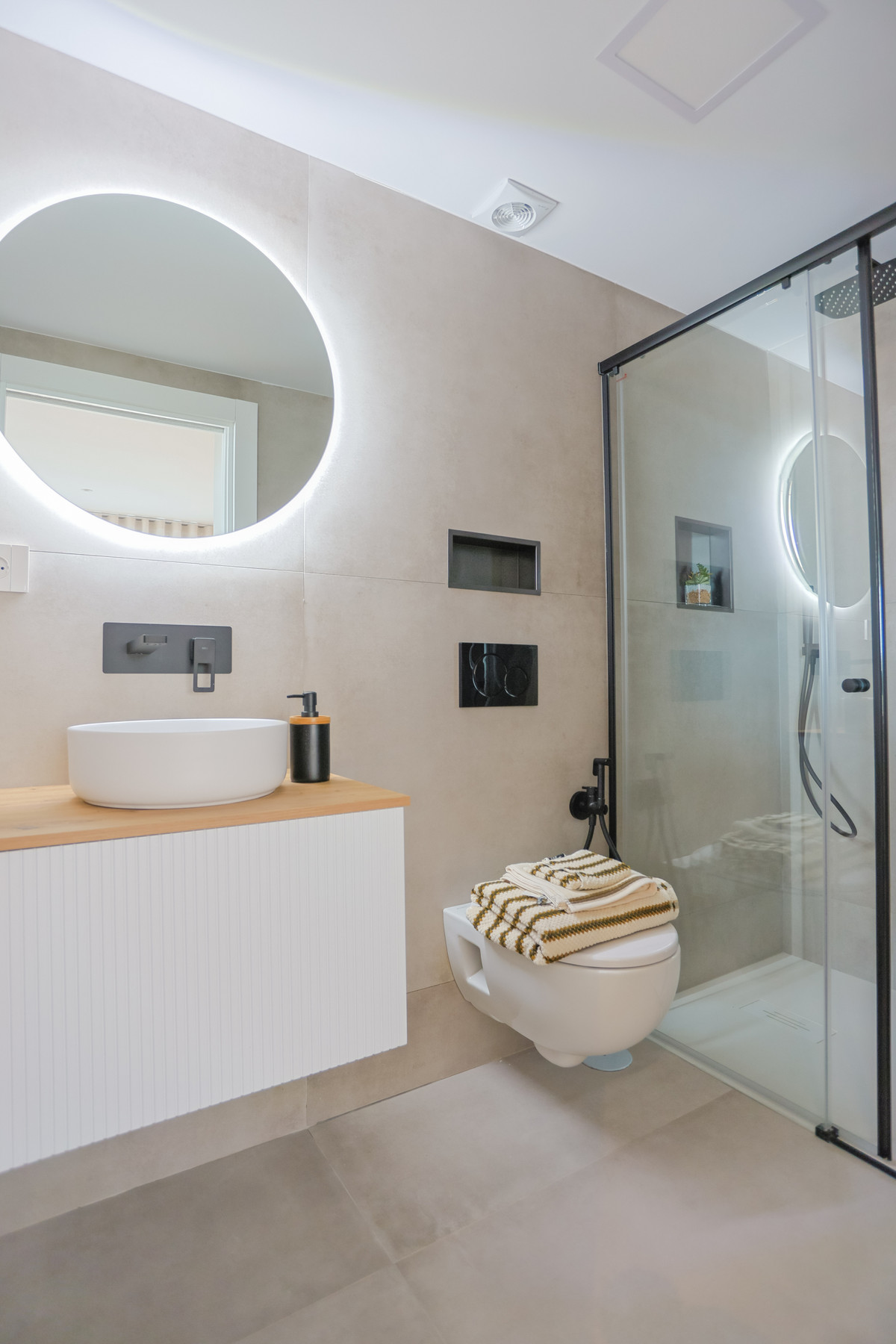 Hovedsoveværelset har et indvendigt badeværelse. Badeværelset er udstyret med store opbevaringsområder og en bruser.