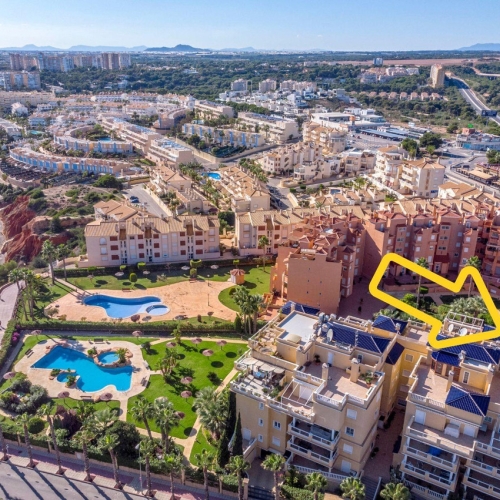 Los Altos Modern 2 bed 2 bath Corner Top Floor apartment for sale with panoramic views of the countryside and to the communal pool and Gardens located in Amanecer VI close to CC with shops, bars and restaurants.