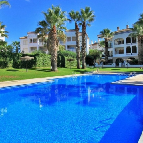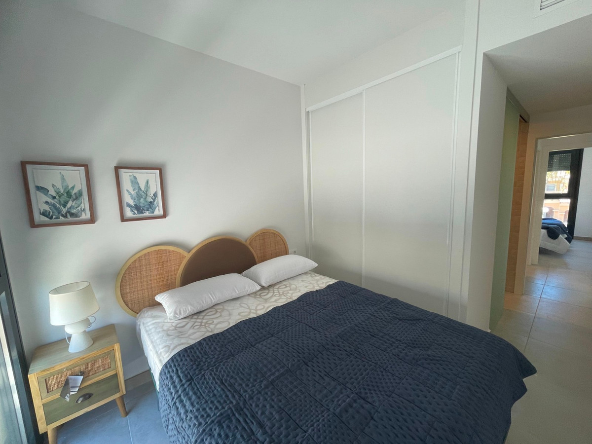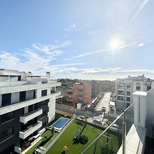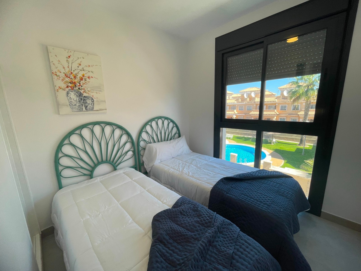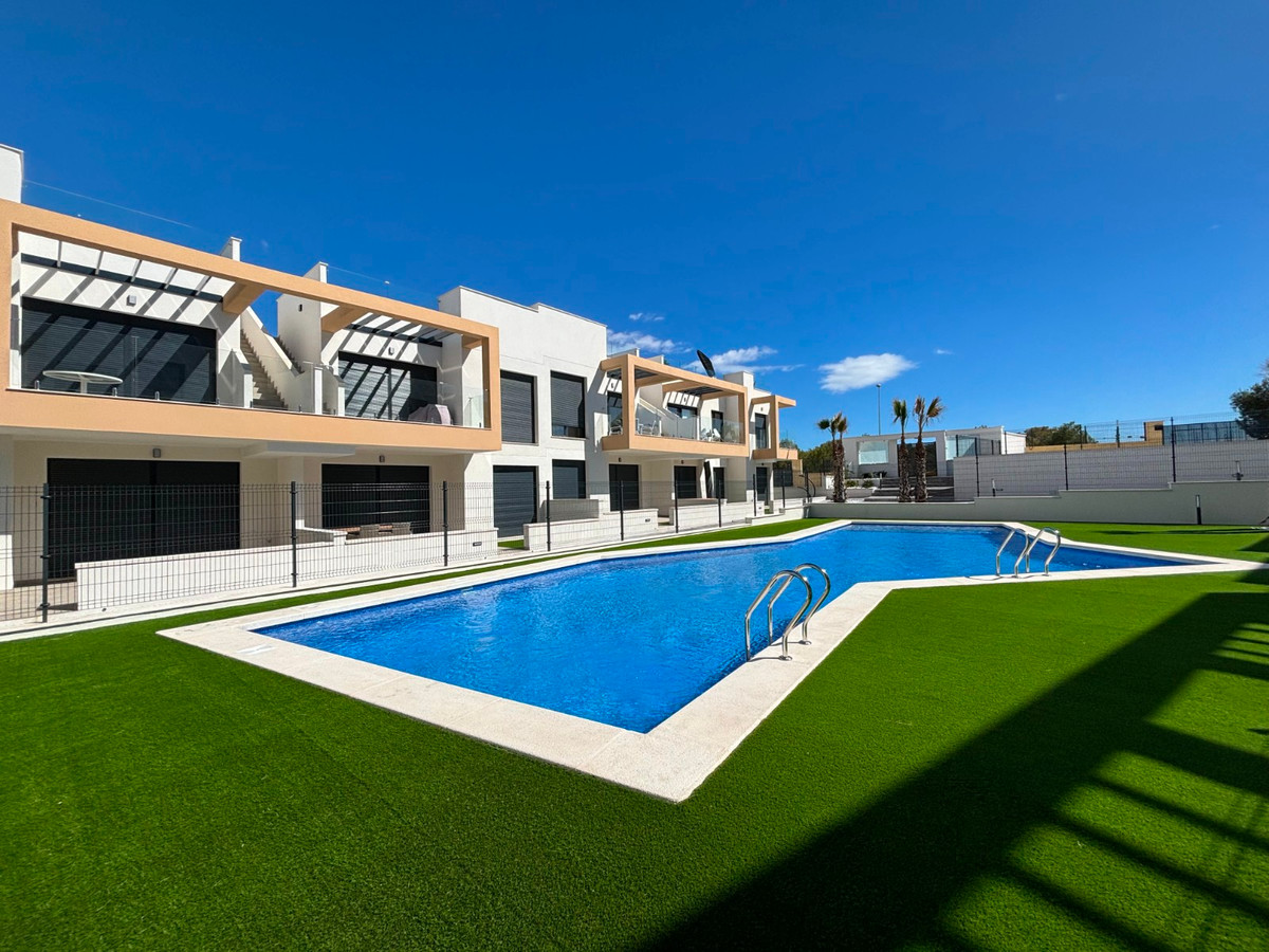 This South Facing, Two Bedroom, Top Floor Corner Apartment is located within a 10 minute walk of a main chain supermarket, JYSK furniture store, and a selection of café bars and restaurants. Villamartin Golf Course is just a 5 minute drive away, while the popular La Zenia Boulevard shopping centre and the beautiful beaches of the Orihuela Costa are only 10 minutes by car. Built in 2023, this stylish first-floor apartment boasts a modern design and bright interior. The open-plan living area features double sliding doors leading out to a partly covered terrace with views over the beautifully laid out communal pool area.  The spacious fitted kitchen offers ample work and storage space along with a breakfast bar. There are two double bedrooms, both with built-in wardrobes, and two sleek shower rooms with under floor heating—one of which is en suite. A standout feature is the impressive 60m² private solarium, accessed via the terrace, offering ample space for sunbathing, entertaining, or enjoying the views. Additional benefits include air conditioning, off-road parking, and access to a stunning communal pool—all set in the heart of Costa Blanca South.\n