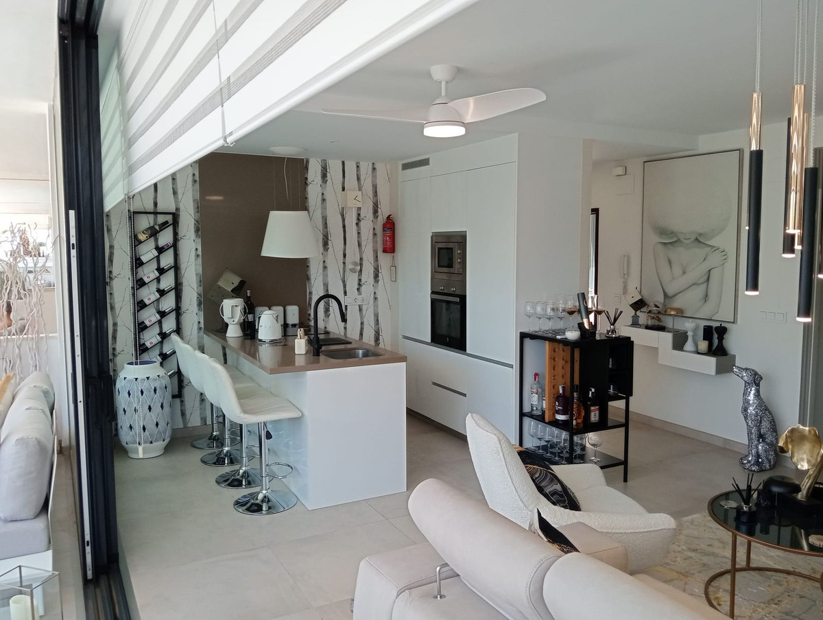 The penthouse apartment features a bright, spacious open-plan living room and kitchen that seamlessly connects to a south-facing terrace, creating the ideal setting for indoor-outdoor living. Floor-to-ceiling sliding glass doors on three sides flood the interior with natural light and offer panoramic views of the surrounding landscape. The modern kitchen is sleek and functional, complete with a stylish breakfast bar, perfect for both everyday cooking and casual dining. Step out onto the sun-drenched terrace overlooking the communal gardens and pool, an inviting space to unwind, entertain, or simply enjoy the warm Mediterranean climate.