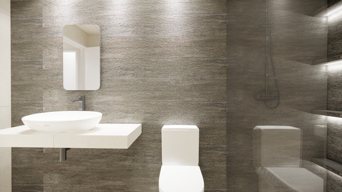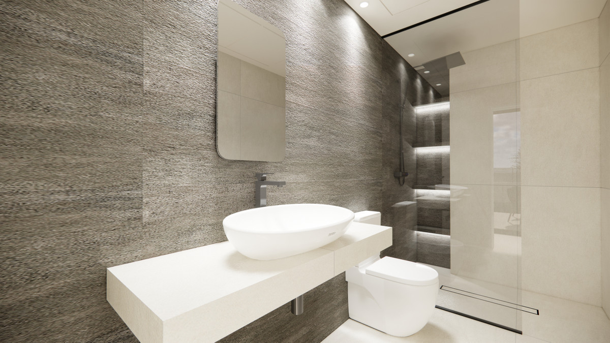 Badeværelserne er udstyret med topkvalitets sanitære apparater, herunder hængende håndvaske, bordpladehåndvaske, brusebakker og glasafskærmninger.