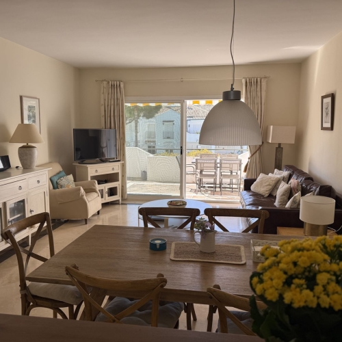 Situated on the second floor, the apartment welcomes you with a well-appointed kitchen to the left and a bedroom with a bathroom to the right as you enter. Moving further in, you'll find a spacious living and dining area that opens onto two private terraces. One of these terraces features a built-in barbecue area with lovely views of the swimming pool—ideal for entertaining and relaxing.