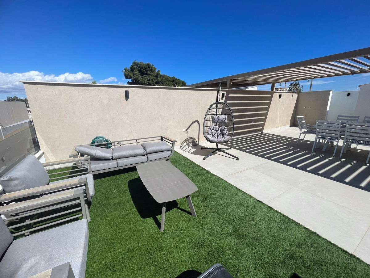 Discover La Llana Beach Resort located in the heart of San Pedro del Pinatar. This Penthouse Apartment consists of 3 bedrooms and 2 bathrooms, living/dining area and a fully fitted kitchen. The property benefits from a front terrace, a spacious solarium with outside kitchen, parking space and storage room