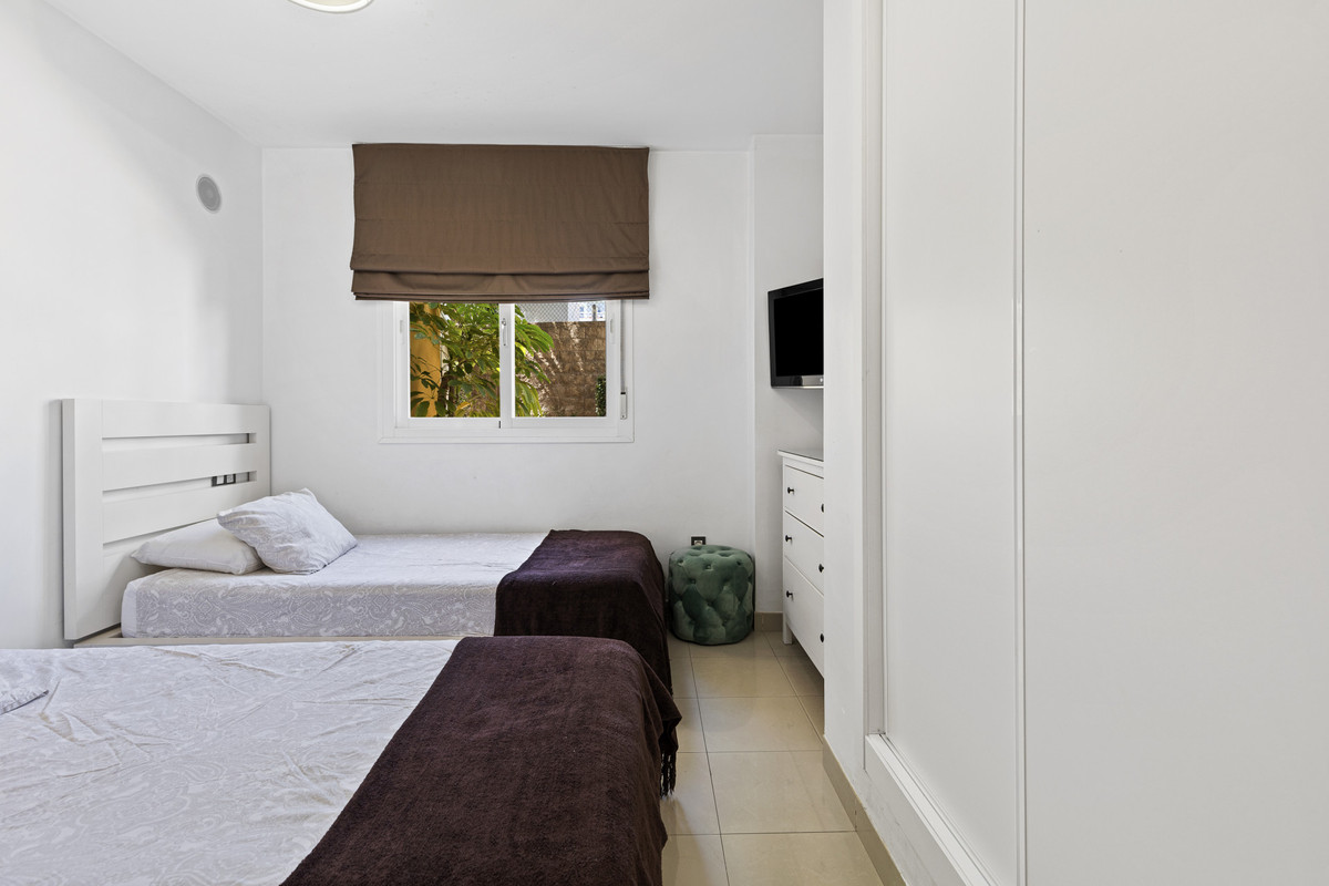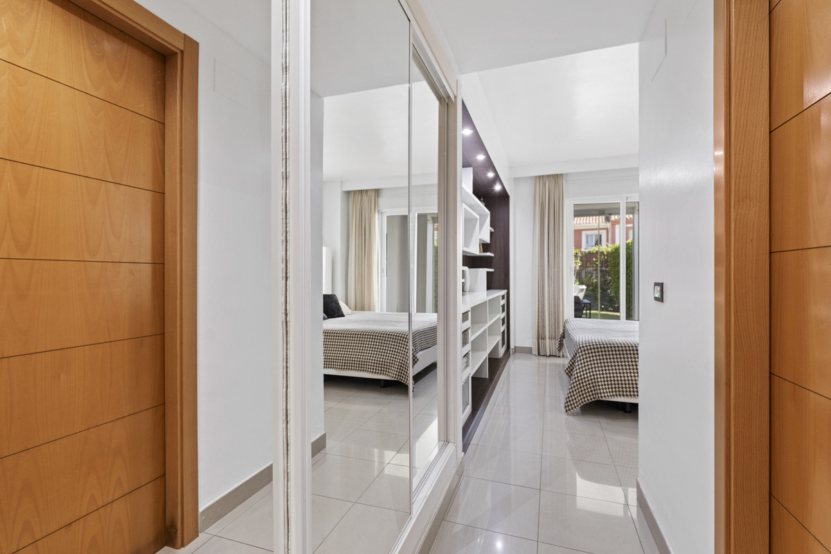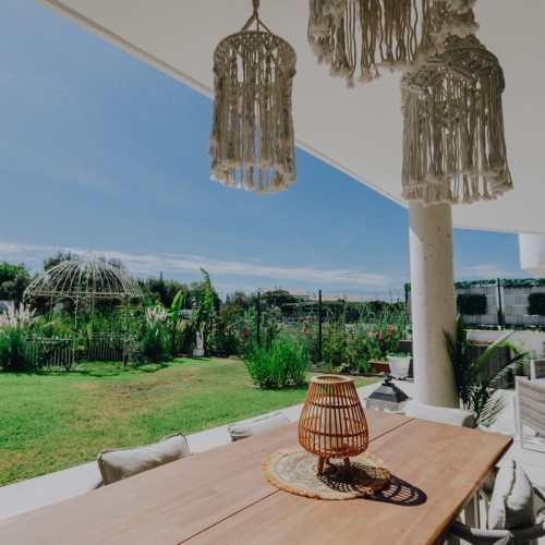 Luxury two-bedroom apartment featuring a spacious living/dining room, fully equipped kitchen with separate utility area, and two bedrooms — one with an en-suite bathroom, the other with a family bathroom. Both bedrooms include built-in wardrobes. A highlight of the property is the large covered terrace with glass curtains, that leads out onto a wonderful private garden. This versatile space comfortably accommodates both seating and dining areas, making it a perfect second living space during the cooler months.