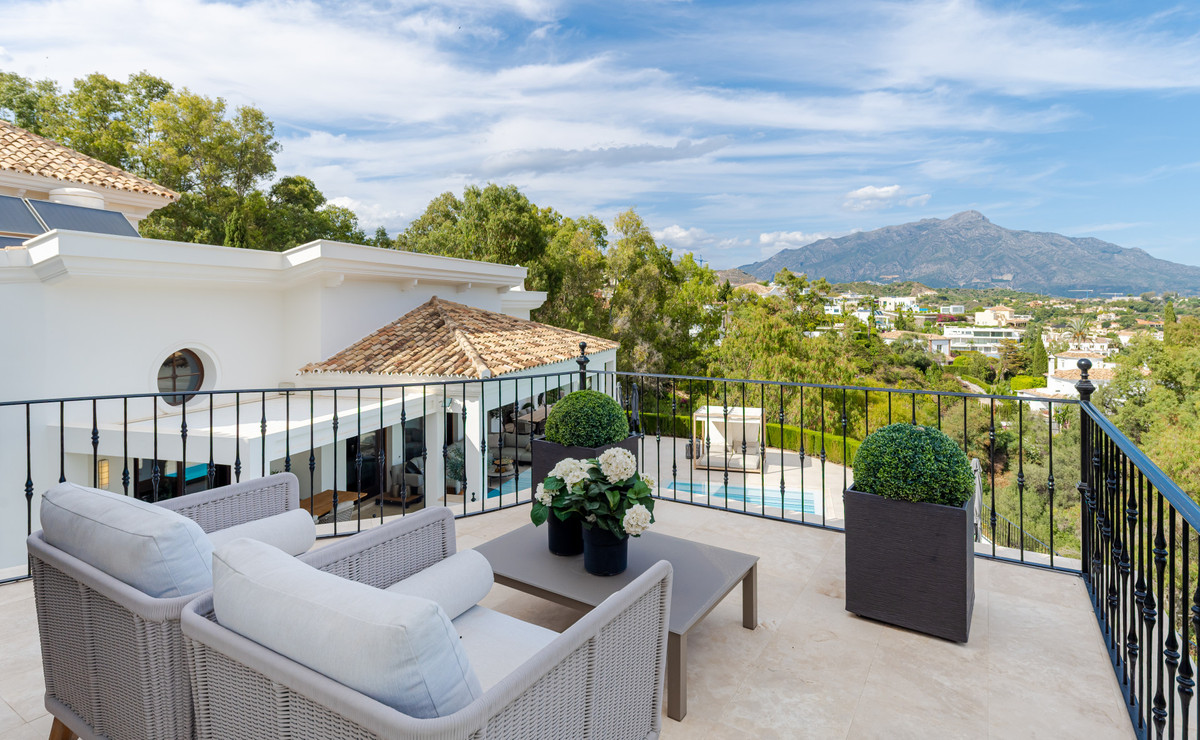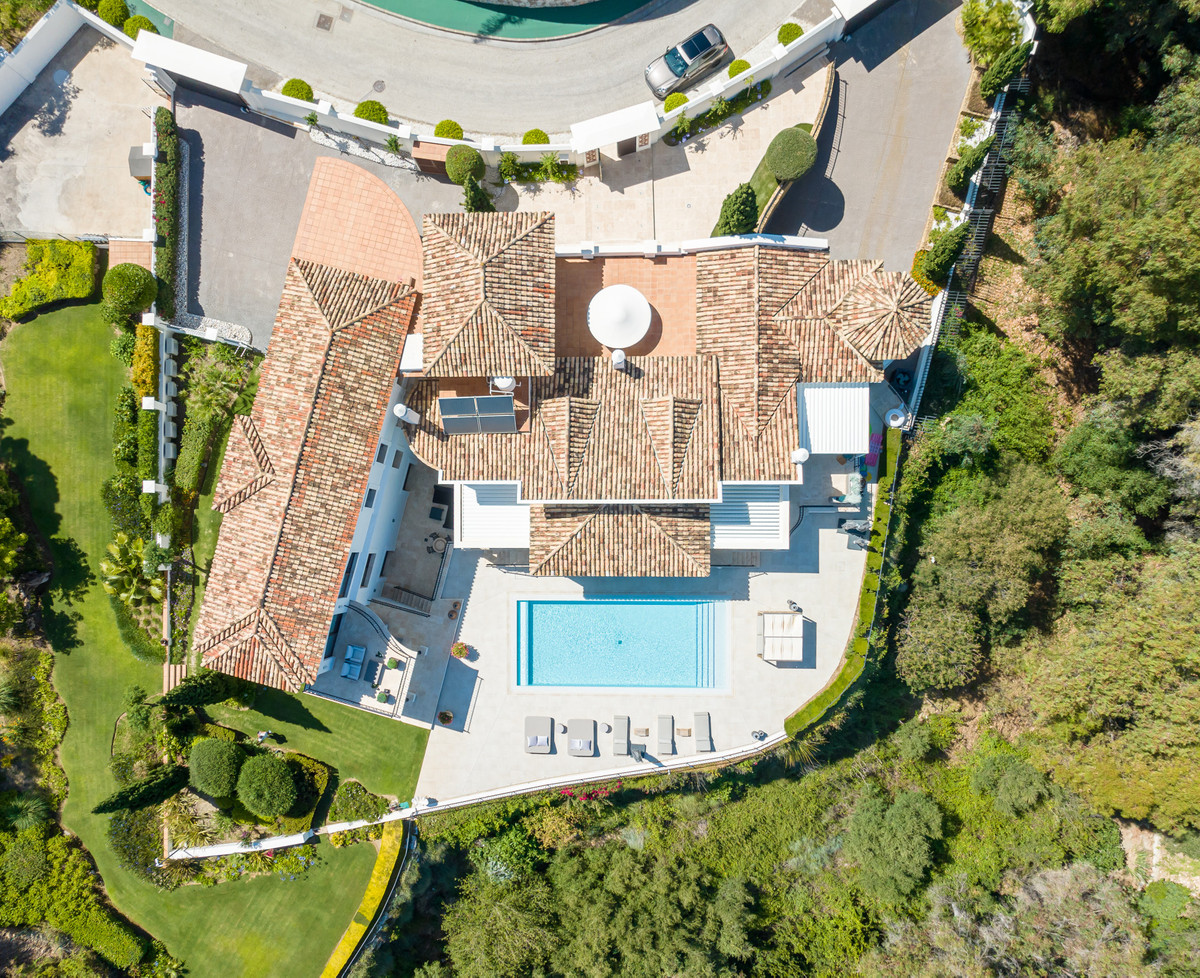community of El Herrojo Alto, and due to its elevated secluded position it offers breath-taking views over its own private estate of more than 10,000m2 and towards the panoramic view of the Mediterranean sea and Marbella's striking La Concha mountain.