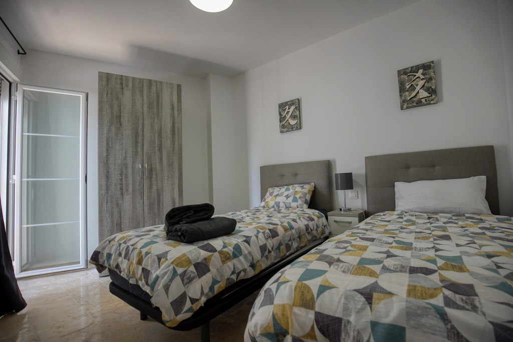 The master bedroom features an en-suite bathroom and direct access to the terrace, while the second bedroom is ideal for guests or a home office. Both bedrooms are equipped with built-in wardrobes.