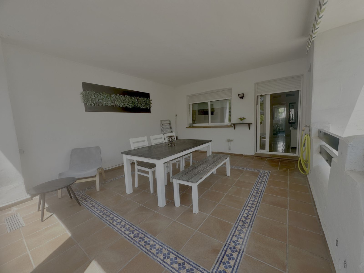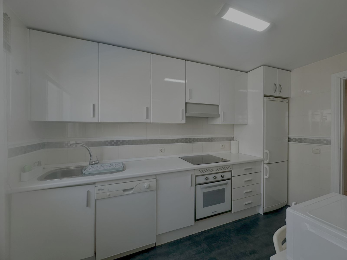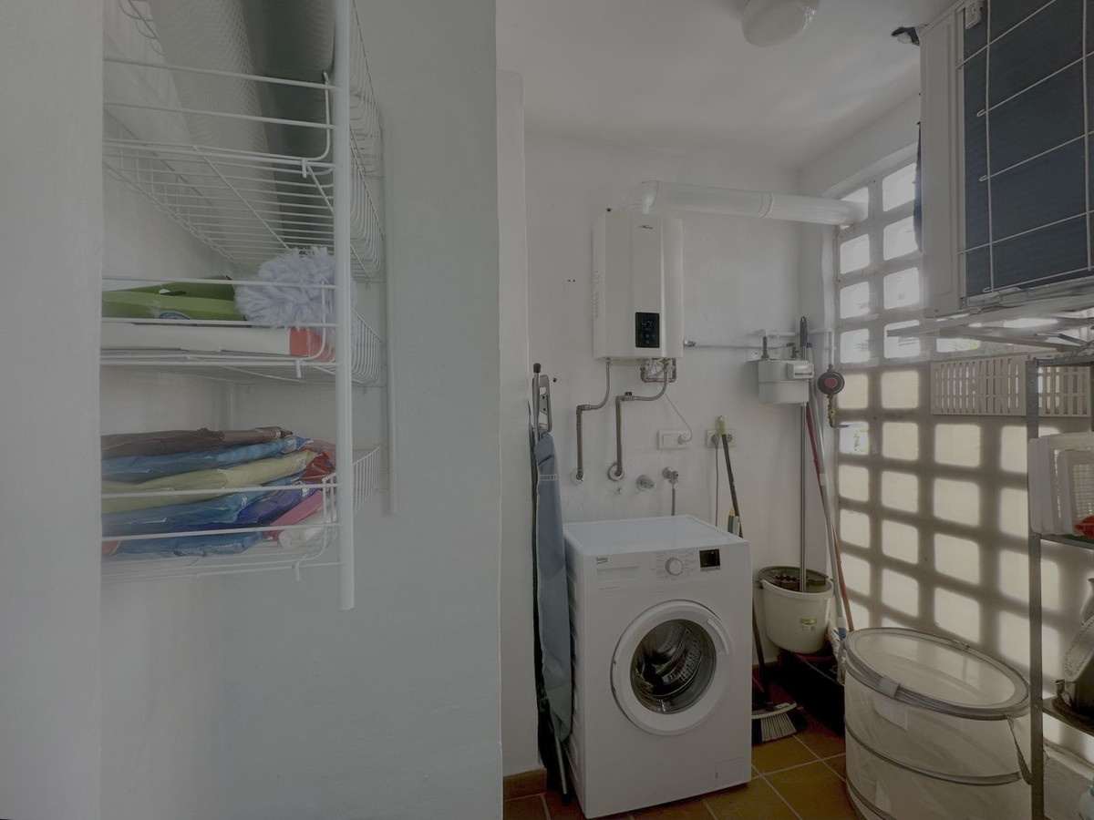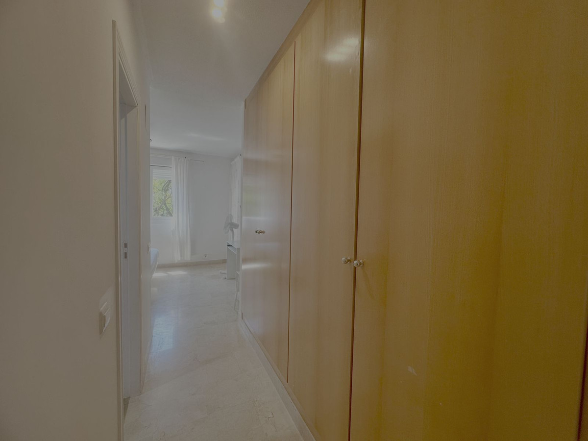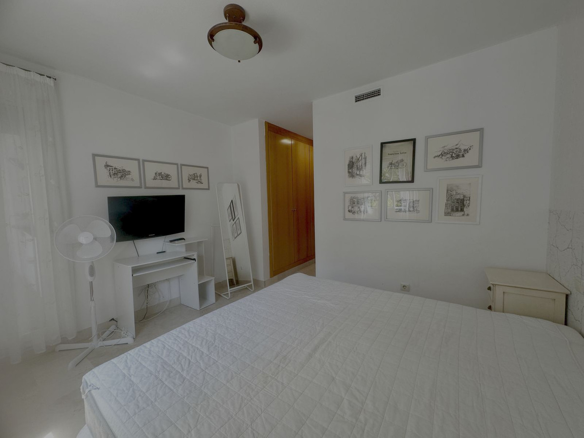 The apartment is thoughtfully laid out and comprises: an entrance hall with a built-in coat cupboard, a bright and square-shaped living-dining room with access to a spacious terrace, ideal for relaxing and soaking up the sun, a fully fitted independent kitchen, a separate utility room, two double bedrooms with fitted wardrobes, and two bathrooms. The generously sized master bedroom features direct access to the terrace, large built-in wardrobes (four-door), and an en-suite bathroom.