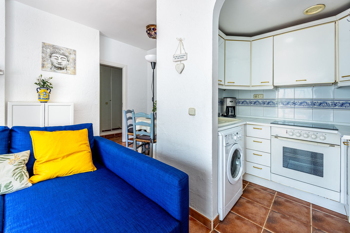 The open-plan living and dining area retains a warm, inviting atmosphere, enhanced by traditional finishes and natural light. The living room leads on to a small terrace, with enough space for a small table and chairs to enjoy the evening breeze.