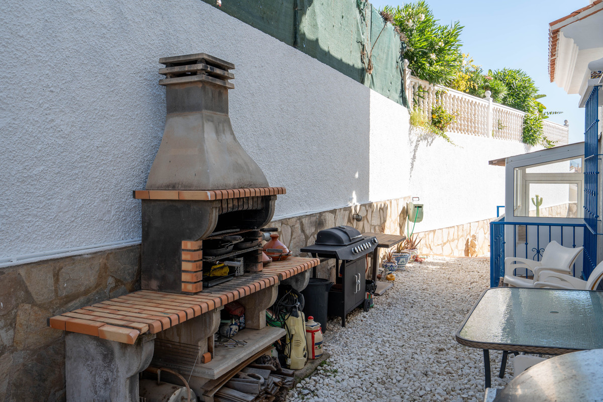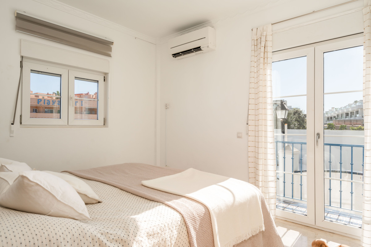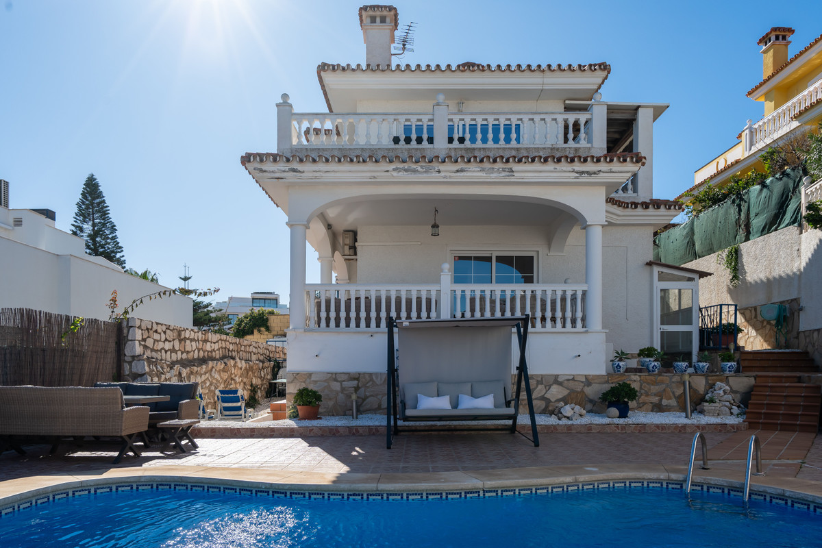 On the second floor, three elegant bedrooms and three contemporary bathrooms provide a serene retreat. The master suite is a standout, boasting panoramic views of the sea, the castle, and Fuengirola, with direct access to a private terrace and an idyllic spot to enjoy the scenery.