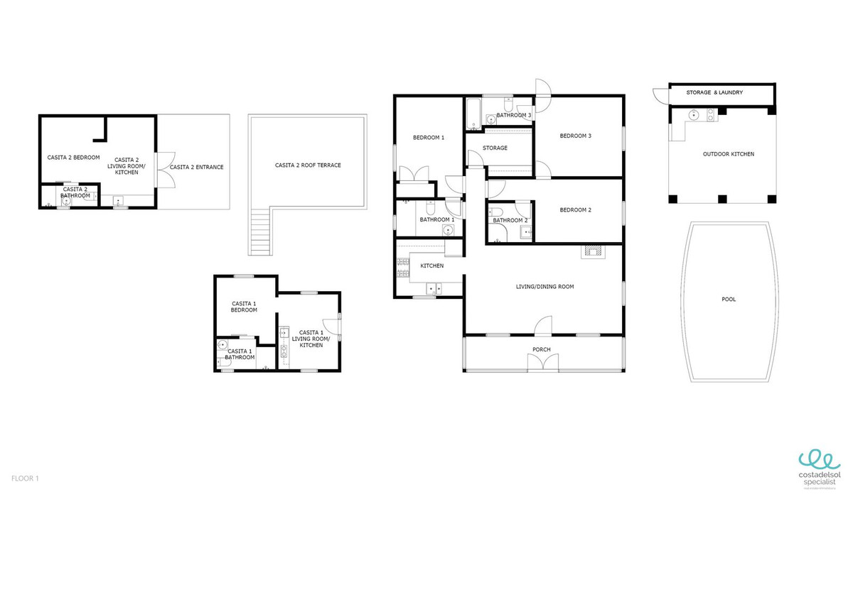 Built in 1995, the villa stands on an almost fully fenced, flat plot of no less than 5,267 m². The main house of 112 m² features three comfortable bedrooms, each with its own en-suite bathroom. One of these bedrooms also has a separate entrance from outside, making it ideal for creating an additional guest apartment or rental unit. The living room in the main house is warmed by a cozy wood-burning stove, creating a warm and inviting atmosphere on cooler evenings, and a heating and cooling air conditioning system ensures comfort throughout the year. All bedrooms, as well as the two casitas, are also equipped with air conditioning.