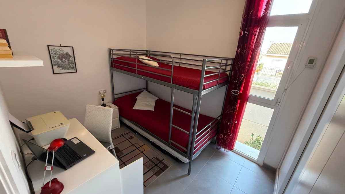 The house offers 78 m² of built area, featuring 2 spacious bedrooms and 2 bathrooms, one of them en-suite with a shower. The open-plan American-style kitchen, complete with a central island, seamlessly connects to the bright and airy living room. Air conditioning is installed in each bedroom and the living area, ensuring year-round comfort.