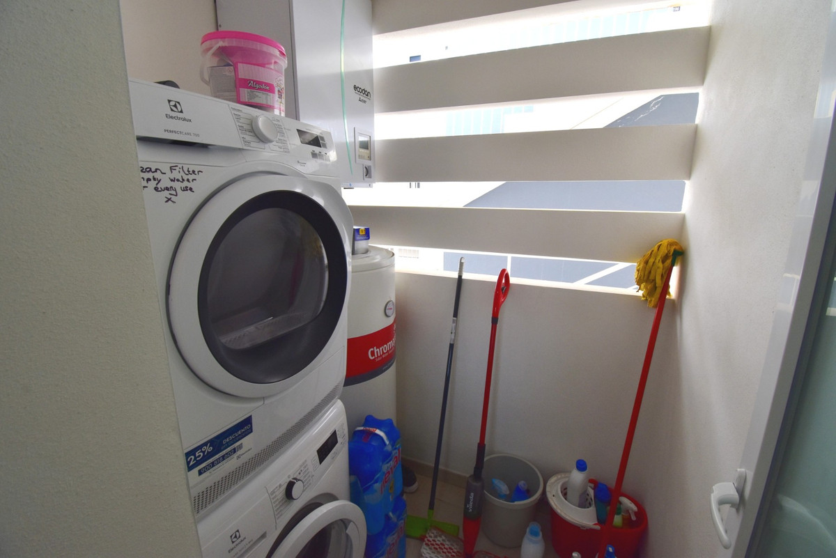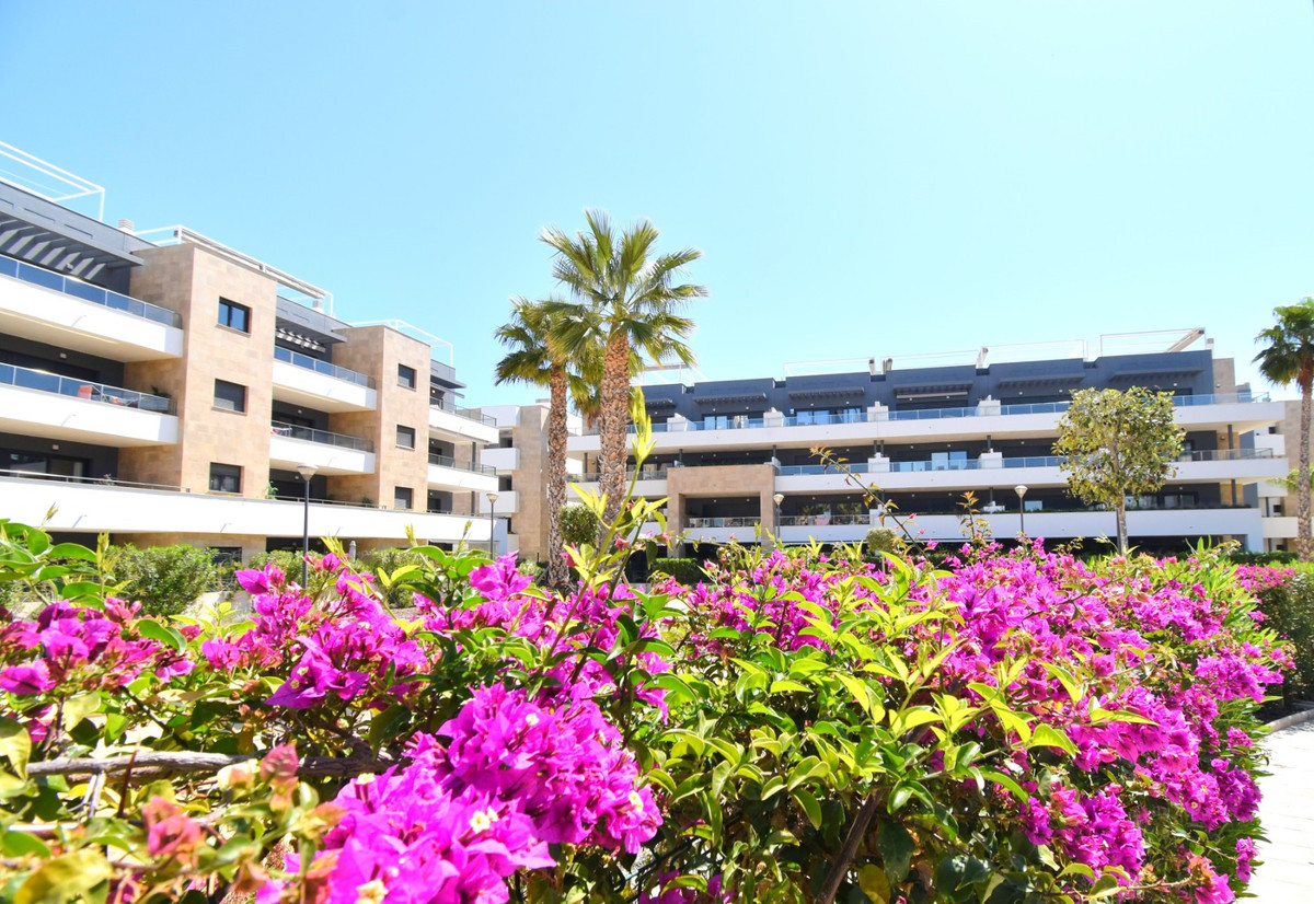 This West Facing, As New, Two Bedroom, Second Floor Apartment in Playa Flamenca, is located within a recently constructed and highly desirable resort, right in the heart of Orihuela Costa. Ideally positioned just a 8-minute walk to the beach, a 2-minute stroll to major chain supermarkets and café bars, and only 15 minutes to the popular La Zenia Boulevard shopping centre. Several top golf courses can also be reached within a 10-minute drive. Set within an impressive 17,000m2 resort, the complex boasts beautifully landscaped communal gardens, winding pathways, two heated swimming pools, three standard pools — one featuring a pool bar — two children's pools, six Jacuzzis, a fully equipped gym with panoramic views, sauna, chill-out zones, pond and fountains, a children's play area, walk and bike paths, and onsite commercial units offering added convenience. The apartment itself is modern, bright and open plan in design, featuring a spacious lounge/dining area with large double sliding glazed doors leading out to the terrace — the perfect spot to relax or dine al fresco. The sleek white fitted kitchen includes a breakfast bar and access to a separate utility room. There are two double bedrooms, both with built-in wardrobes, and the master benefits from direct access to the terrace and a stylish en suite shower room with door into the WC. Additional features include ducted air conditioning throughout, lift access within the block, and an allocated underground parking space. A stunning property in an exceptional setting — perfect for holidays, rental investment or full-time living on the Costa Blanca South.\n