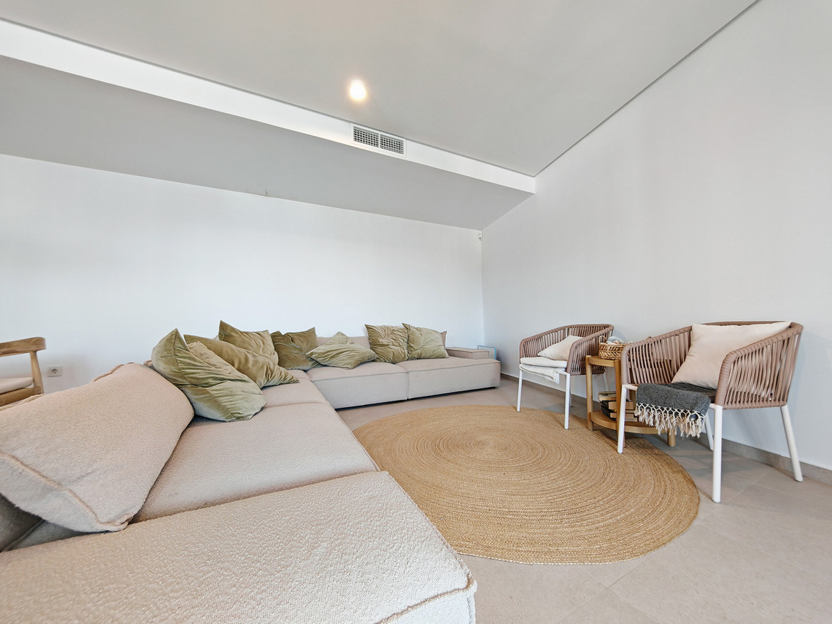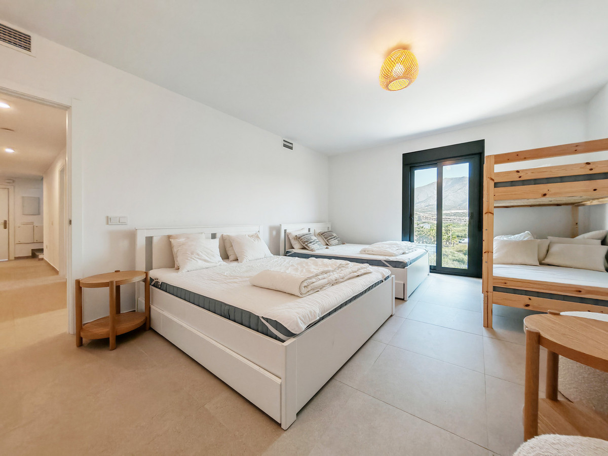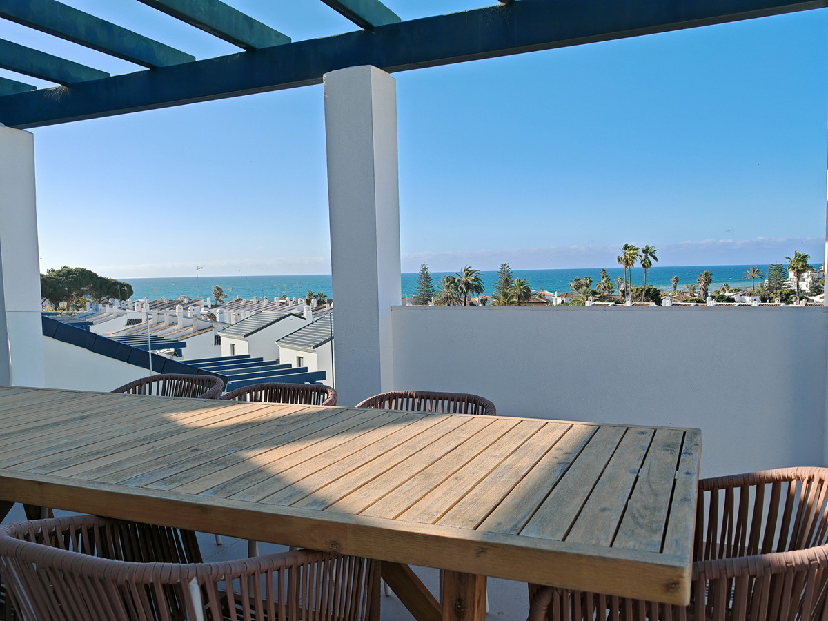 Duplex Penthouse for sale in Arroyo Vaquero, Estepona with 4 bedrooms, 3 bathrooms, 2 en suite bathrooms, 1 toilet and with orientation south, with communal swimming pool, private garage (1 parking spaces) and communal garden. Regarding property dimensions, it has 182 m² built and 149 m² terrace. Has the following facilities amenities near, transport near, air conditioning, central heating, fully fitted kitchen, fireplace, guest room, storage room, alarm, double glazing, video entrance, dining room, private terrace, kitchen equipped, living room, sea view, security shutters, laundry room, covered terrace, fitted wardrobes, garden view, beach side, close to children playground, close to sea / beach, glass doors, balcony, optional furniture, excellent condition, close to town and surveillance cameras.