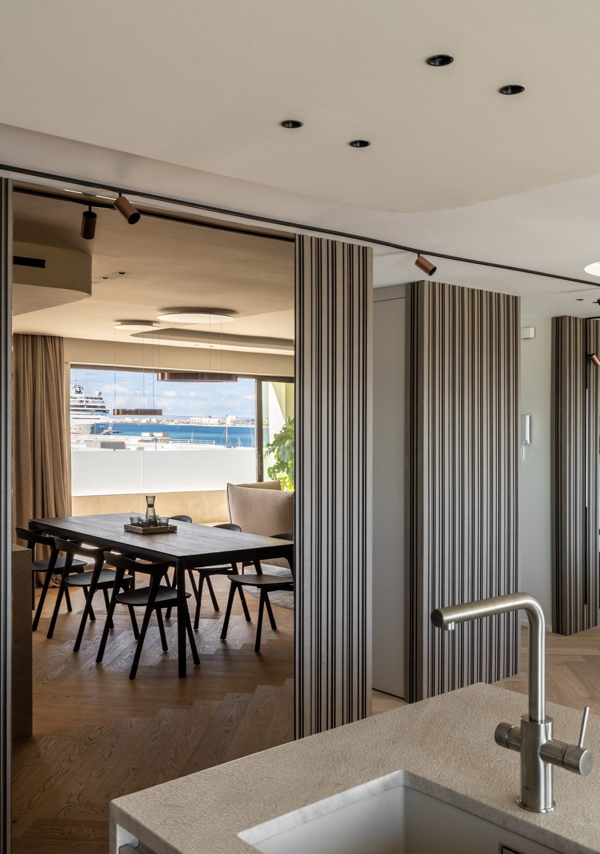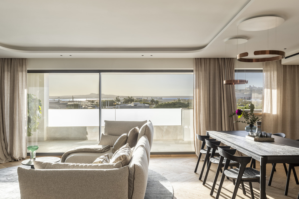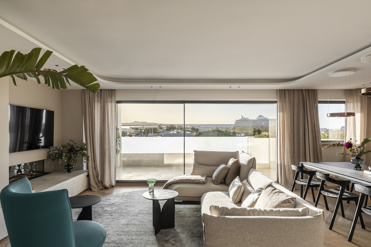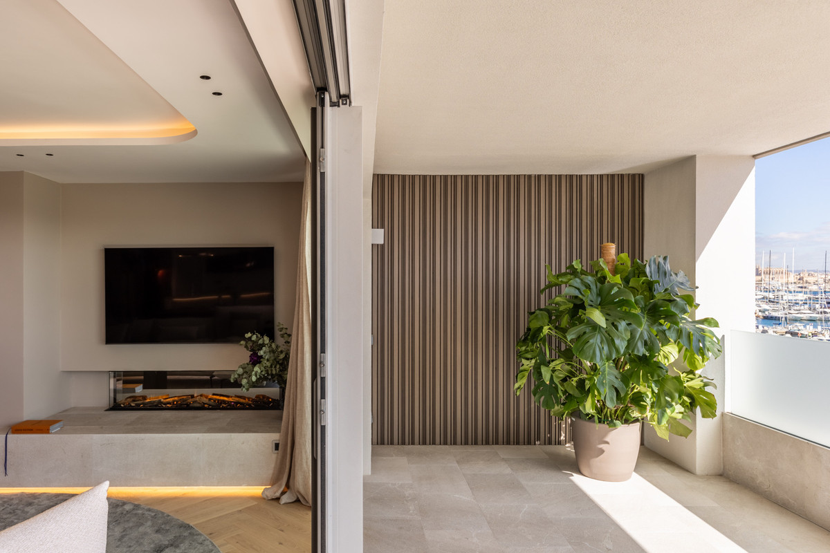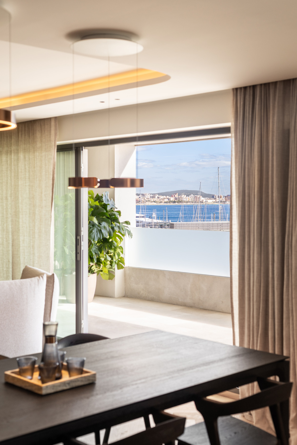 Large sliding doors from the living area open to an expansive private terrace. From here, residents can soak in panoramic views of the sea, the bustling harbor, the majestic cathedral, and the distant city skyline. The terrace provides an ideal setting for morning coffees, al fresco dining, or quiet evenings overlooking the lights of Palma. Two floors down, a shared saltwater swimming pool adds another dimension to the leisure offerings, perfect for cooling off on warm Mediterranean days.
