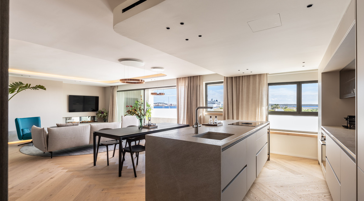 The main living area is designed for seamless day-to-day enjoyment and entertaining. The open-plan layout connects a spacious lounge and an elegantly appointed kitchen equipped with a large island, creating a natural hub for family gatherings and dinner parties. The kitchen showcases top-of-the-line appliances from BORA, Siemens, and Bosch, along with sleek custom Santos cabinetry and refined Grey Balear stone countertops, offering both aesthetic appeal and practical functionality.